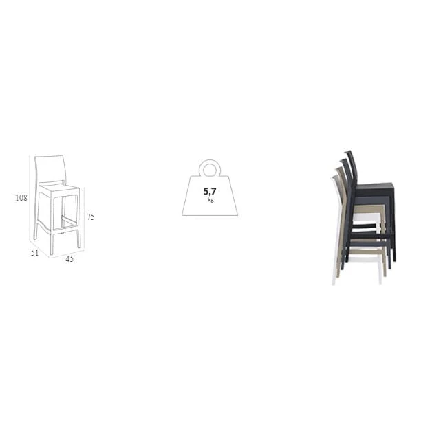 Височина на стола – 108 cm; височина на седалката 75 сm.