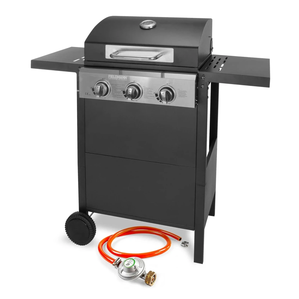 Fieldmann FZG 3003 е перфектен избор за всеки любител на вкусната скара и прекараното време на открито. Тази газова скара с три мощни горелки от неръждаема стомана ви позволява да приготвяте разнообразни ястия с прецизен контрол върху температурата – бързо, удобно и без нужда от въглища.