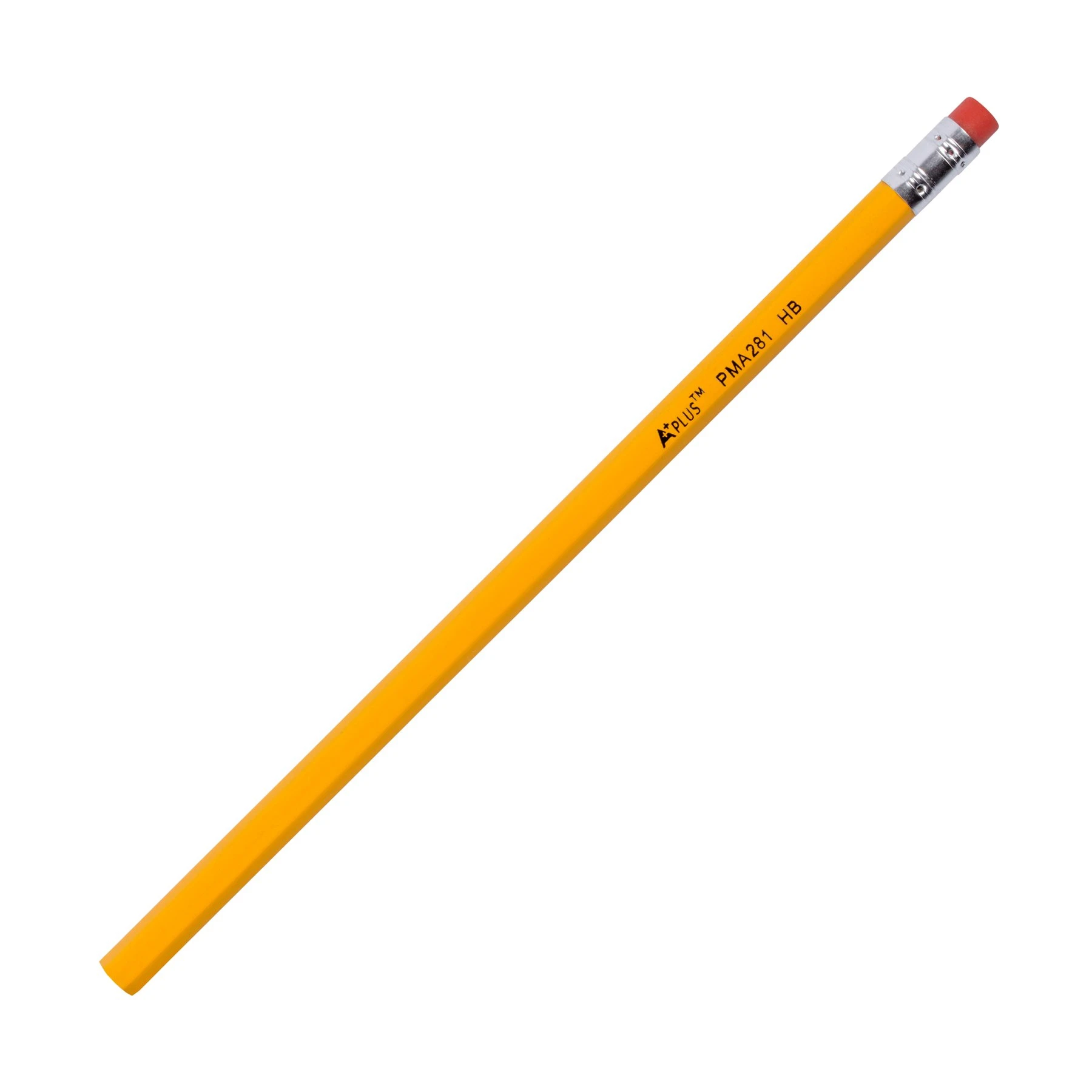 Обикновен чернографитен молив с шестоъгълна форма и гума.