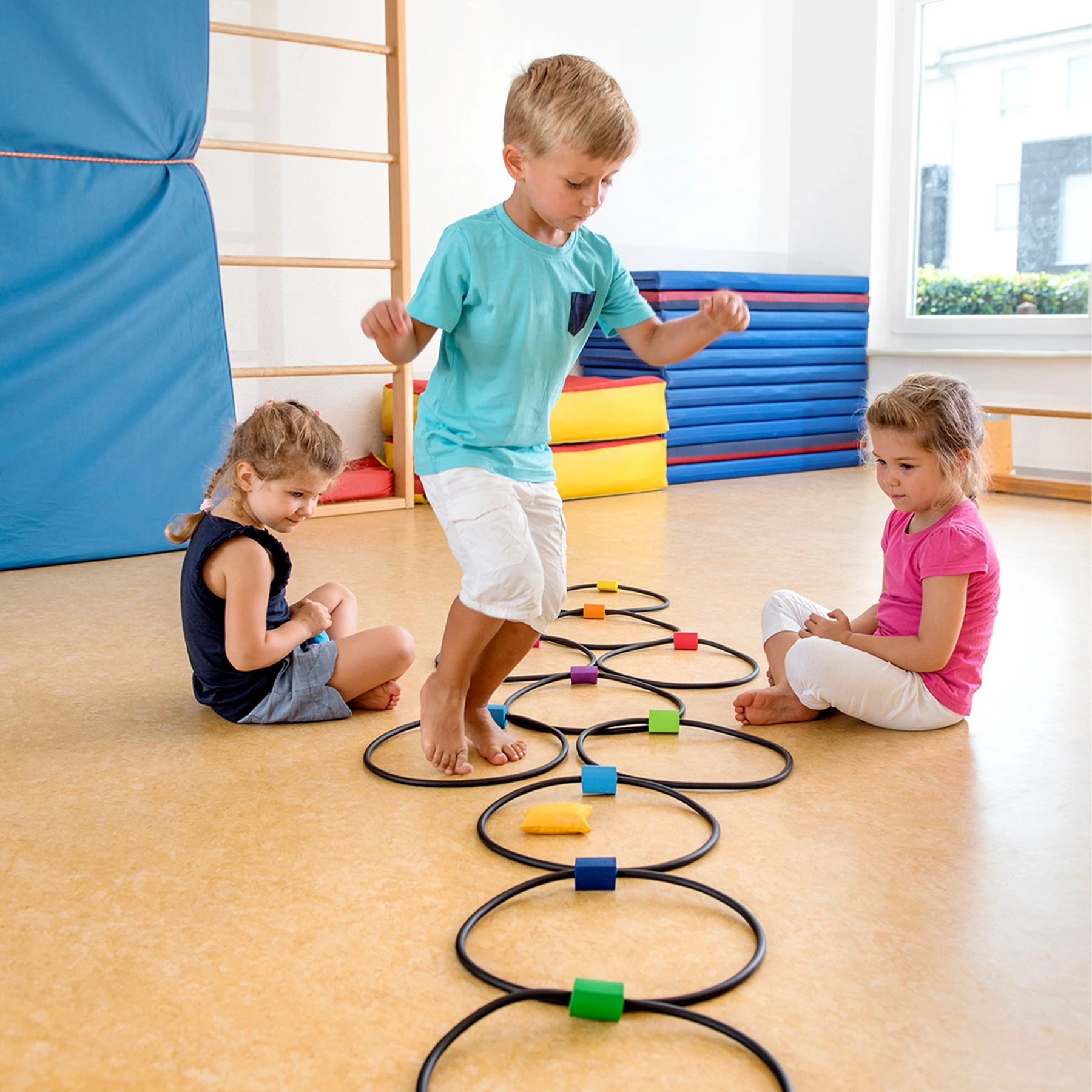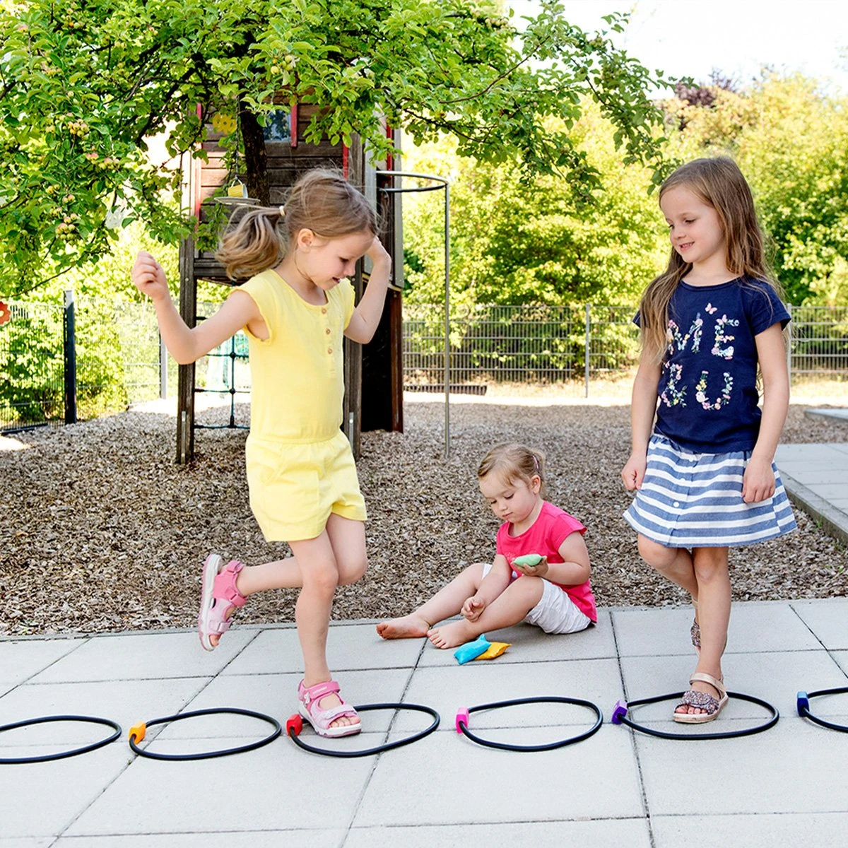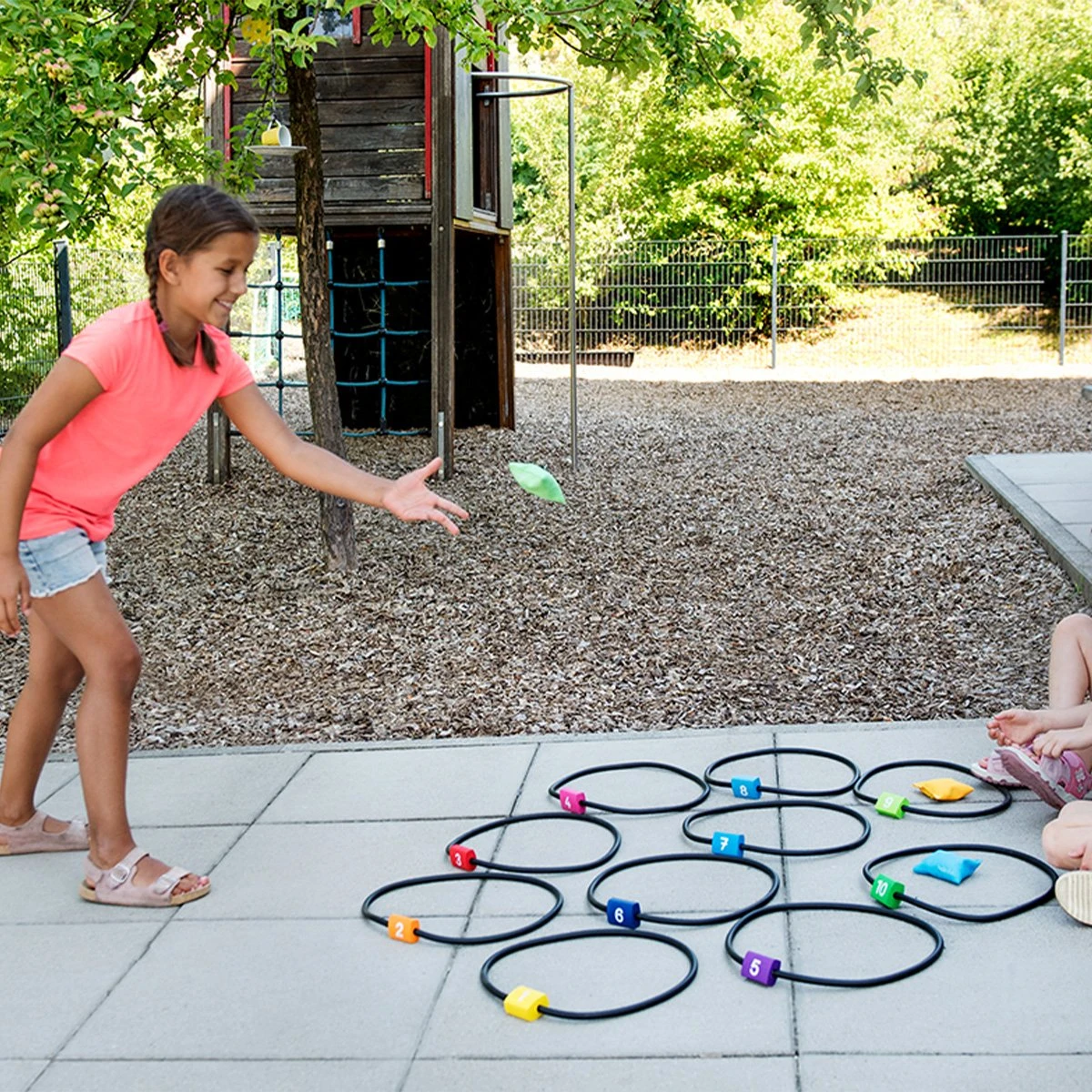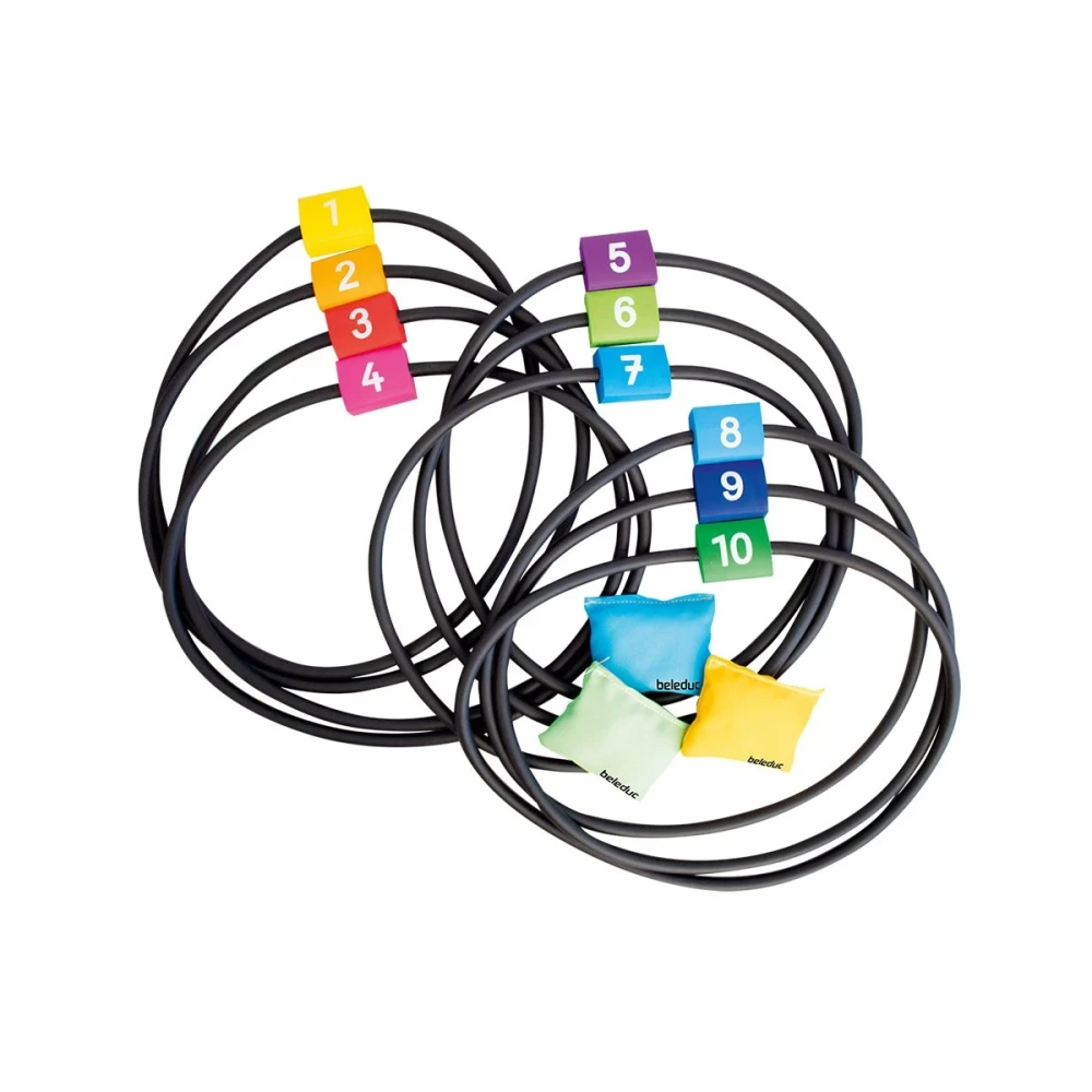 Цветните пръстени могат да се използват за различни игри, а торбичките за хвърляне осигуряват голямо забавление.