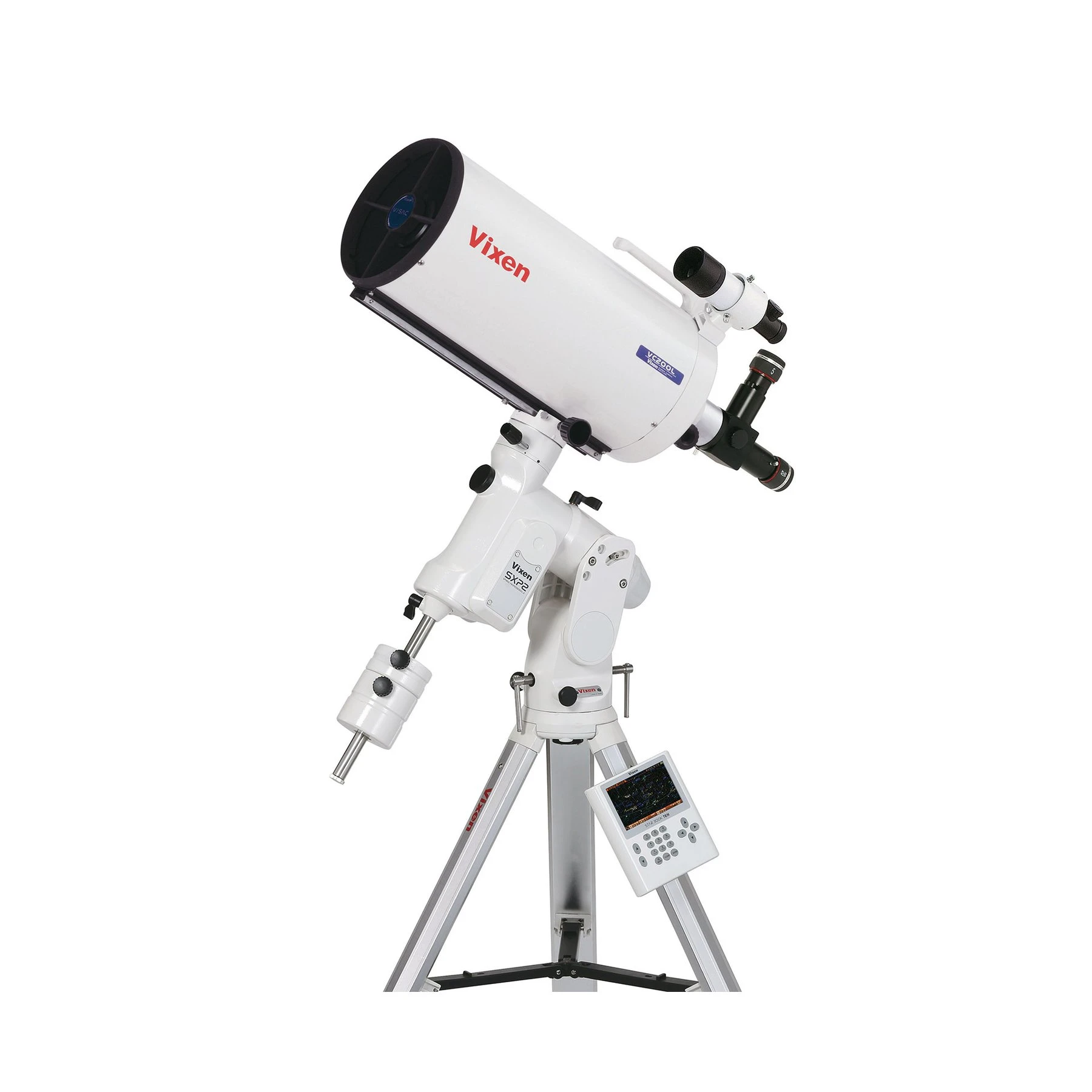 Стойка SXP2 с телескоп VC200L Този комплект телескоп има всичко необходимо, за да наблюдавате нощното небе. Включва телескоп, стойка с автоматично проследяване, статив и два окуляра. Стойката SXP2 идва с новия контролер STARBOOK TEN и полярния визьор PFL-II, което ви позволява да конфигурирате монтажа бързо и лесно чрез референтни звезди.
