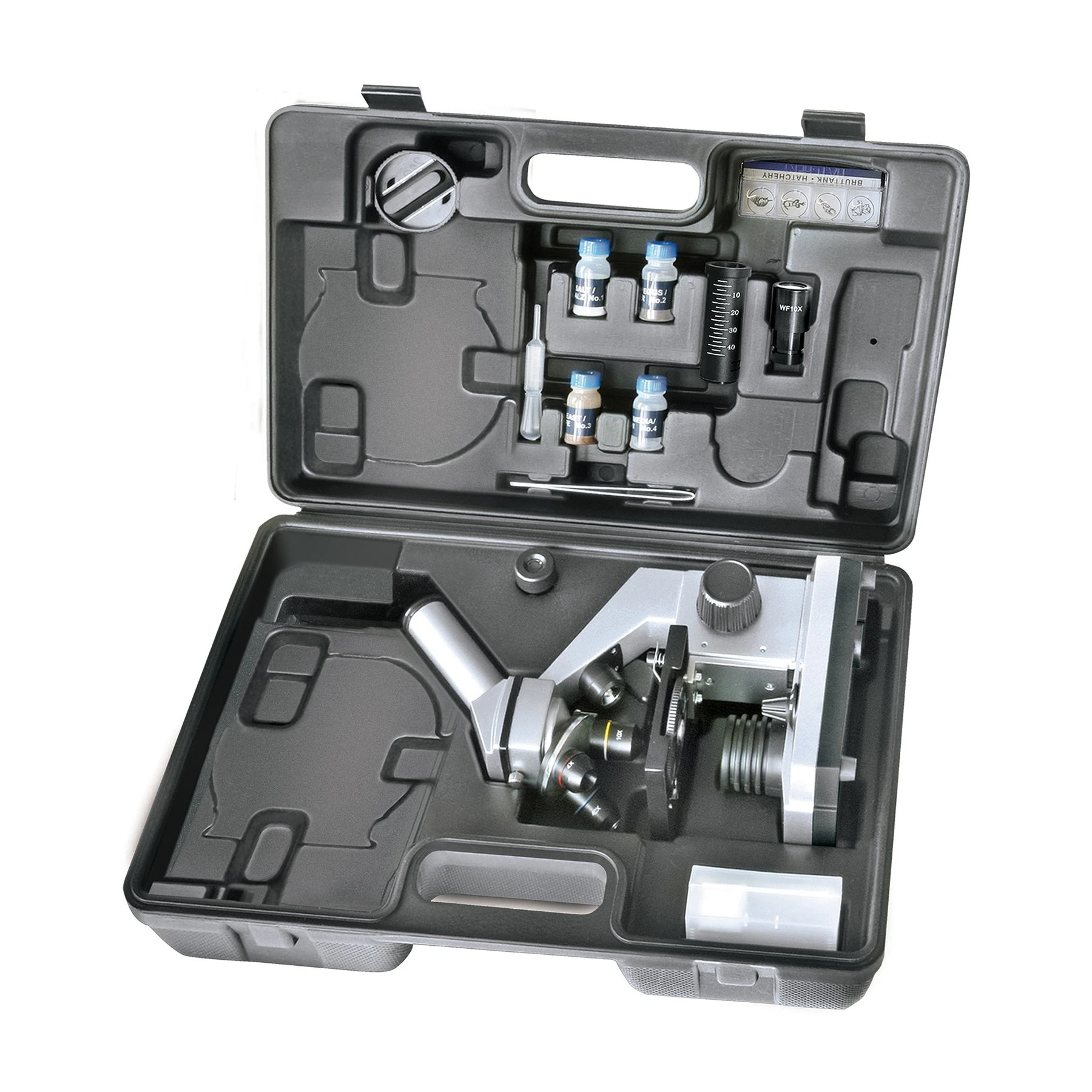 Комплектът включва: –микроскоп; –куфар за пенос и съхранение; –адаптер за смартфон; –2 окуляра (WF10x, WF16x); –3 обектива (4x, 10x, 40x); –Barlow обектив; –5 празни слайда; –клей; –5 покривни стъкла; –капкомер; –микротом; –комплект (Artemia); –3 x AA батерии; –инструкции.
