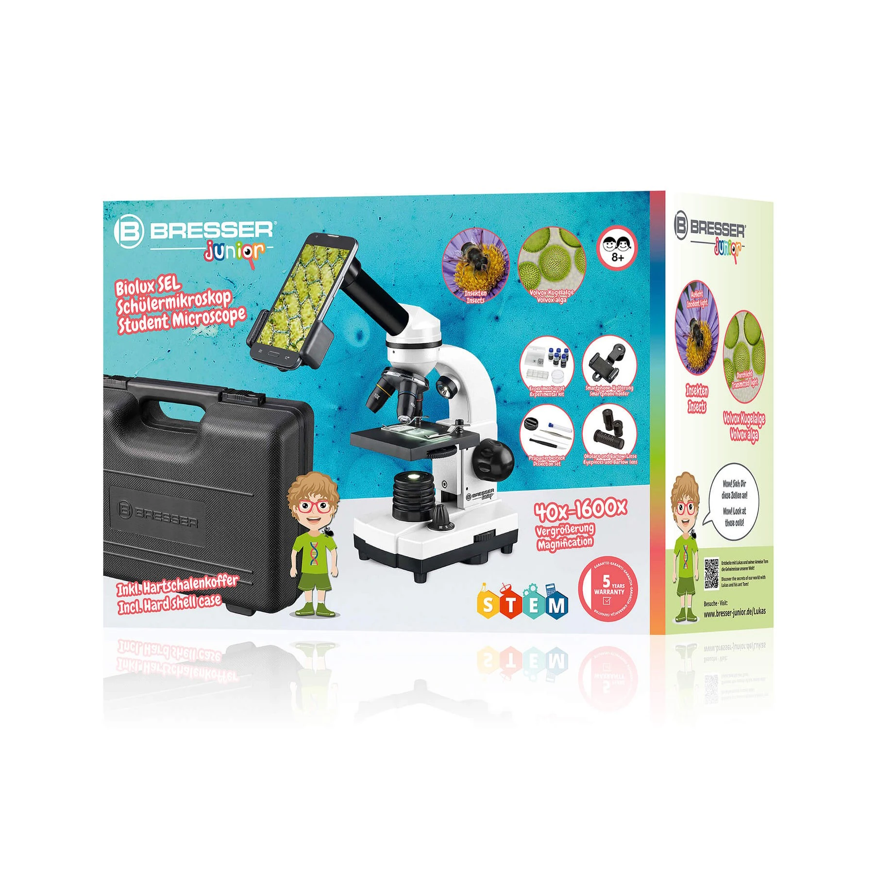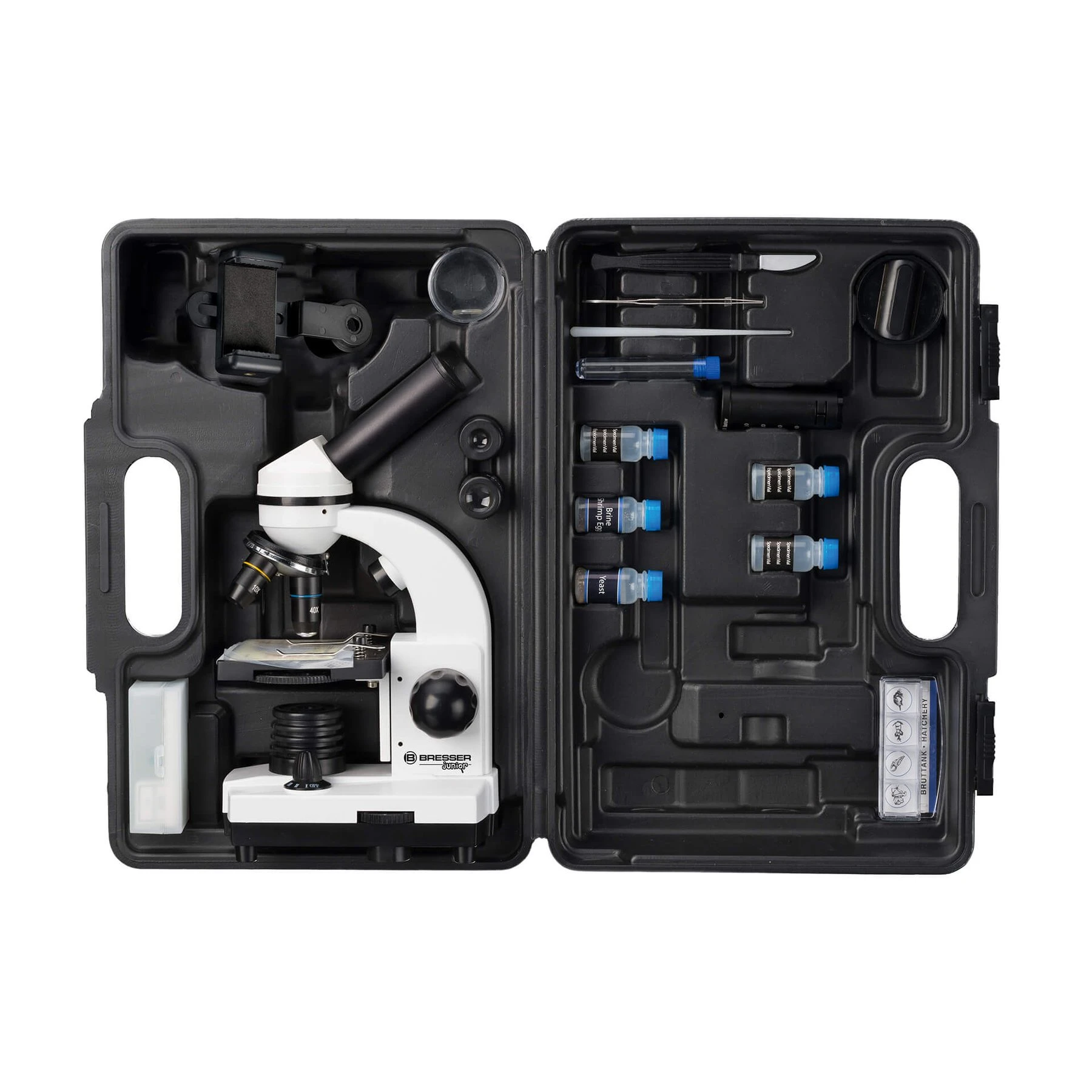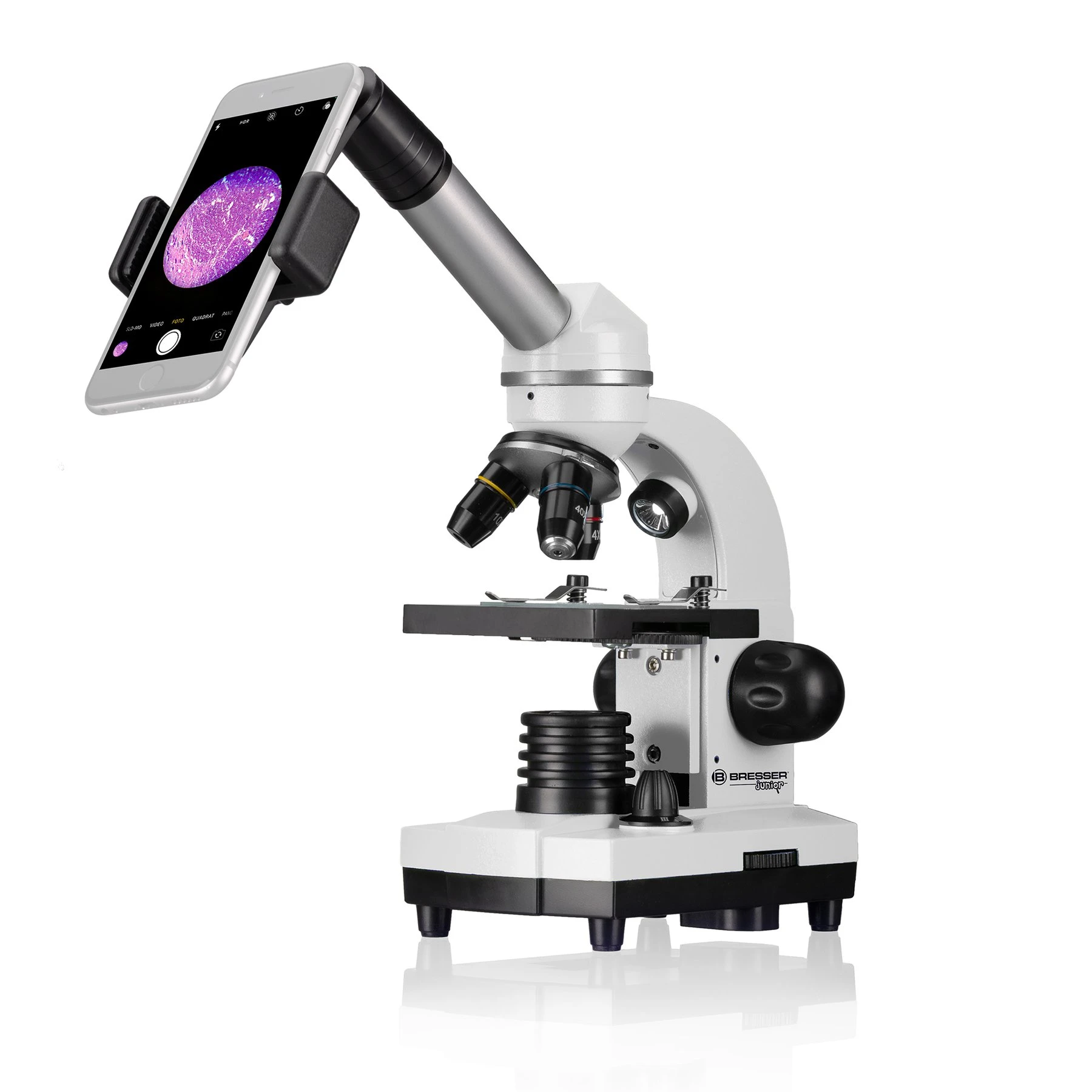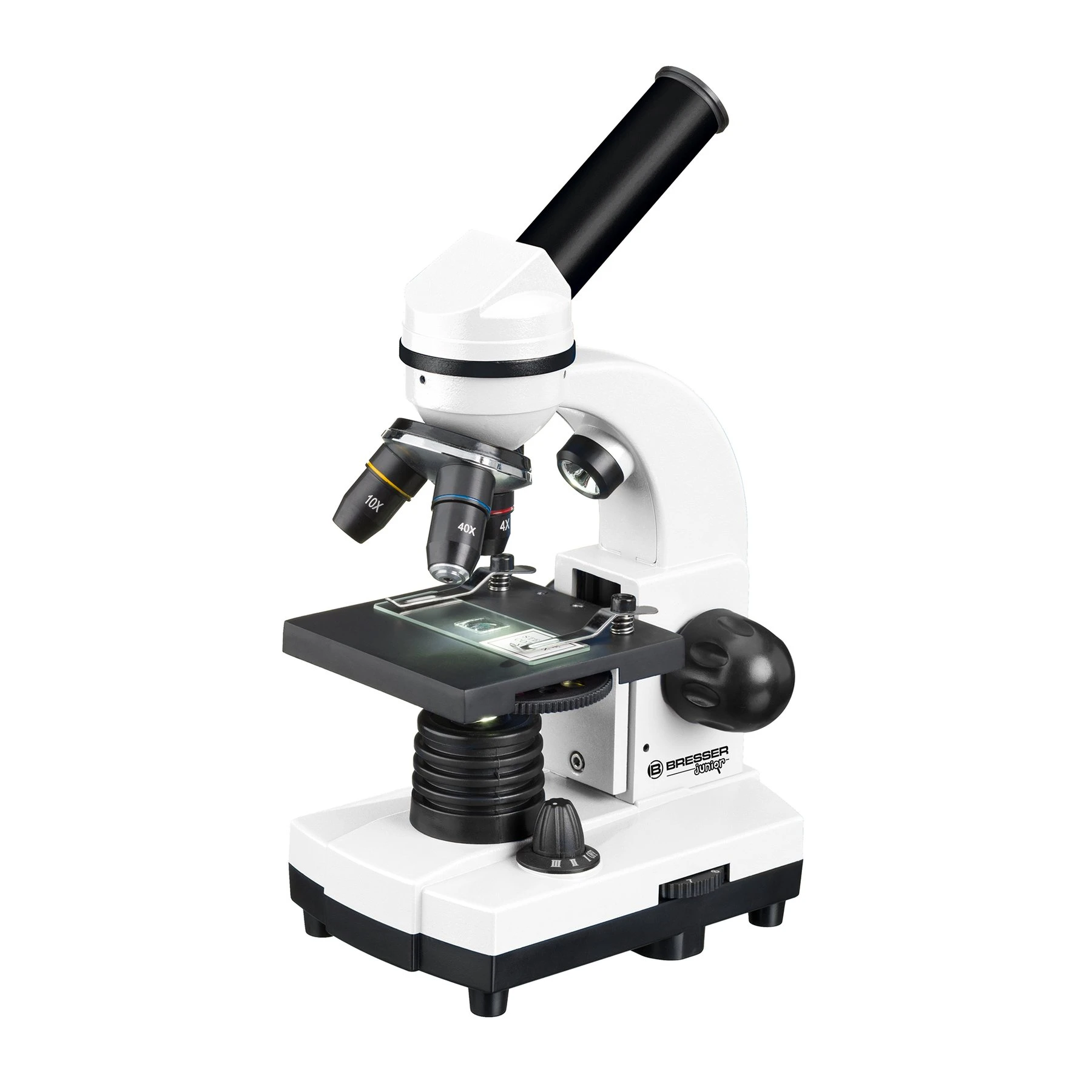 Ученическият микроскоп BRESSER JUNIOR с богата гама от аксесоари е достатъчен за начални стъпки в експериментите. С помощта на изваждаща се допълнителна леща, увеличението може да се регулира безстепенно до 2 пъти по време на визуално наблюдение, така че да се постигне увеличение от 40x до 1600x заедно с 3 обектива и 2 сменяеми широкоъгълни окуляра.