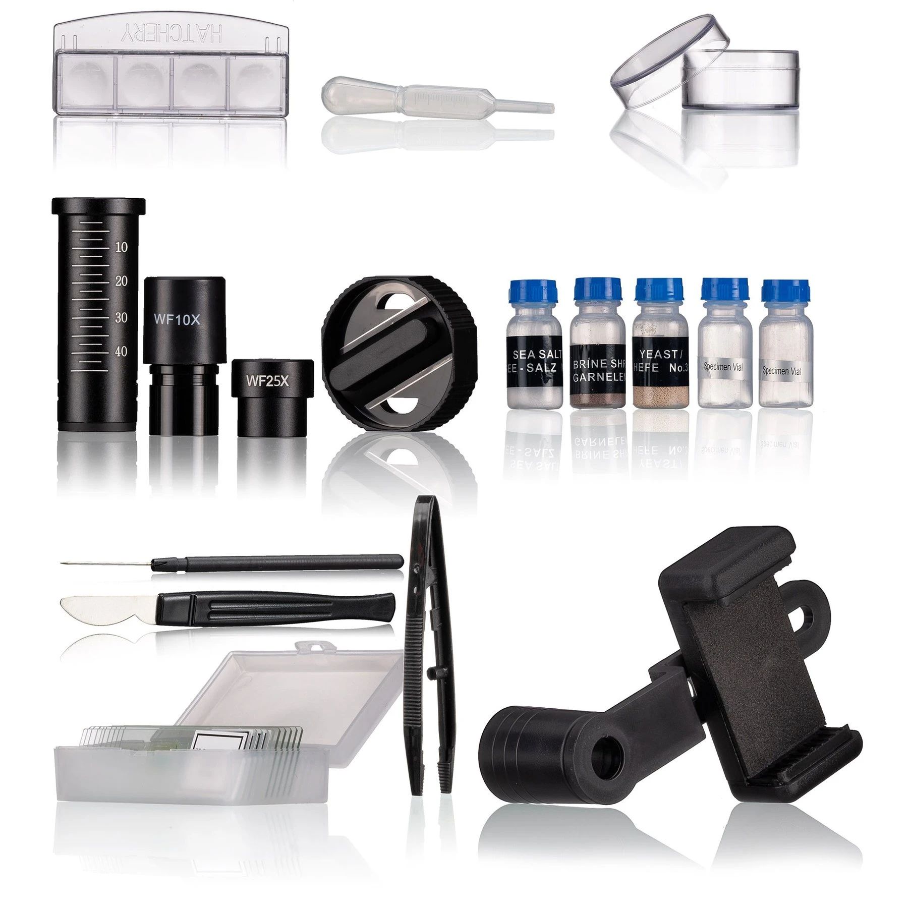 Комплектът включва окуляри и обективи за различни увеличения, регулируема поставка и допълнителни аксесоари за безопасност и стабилност.