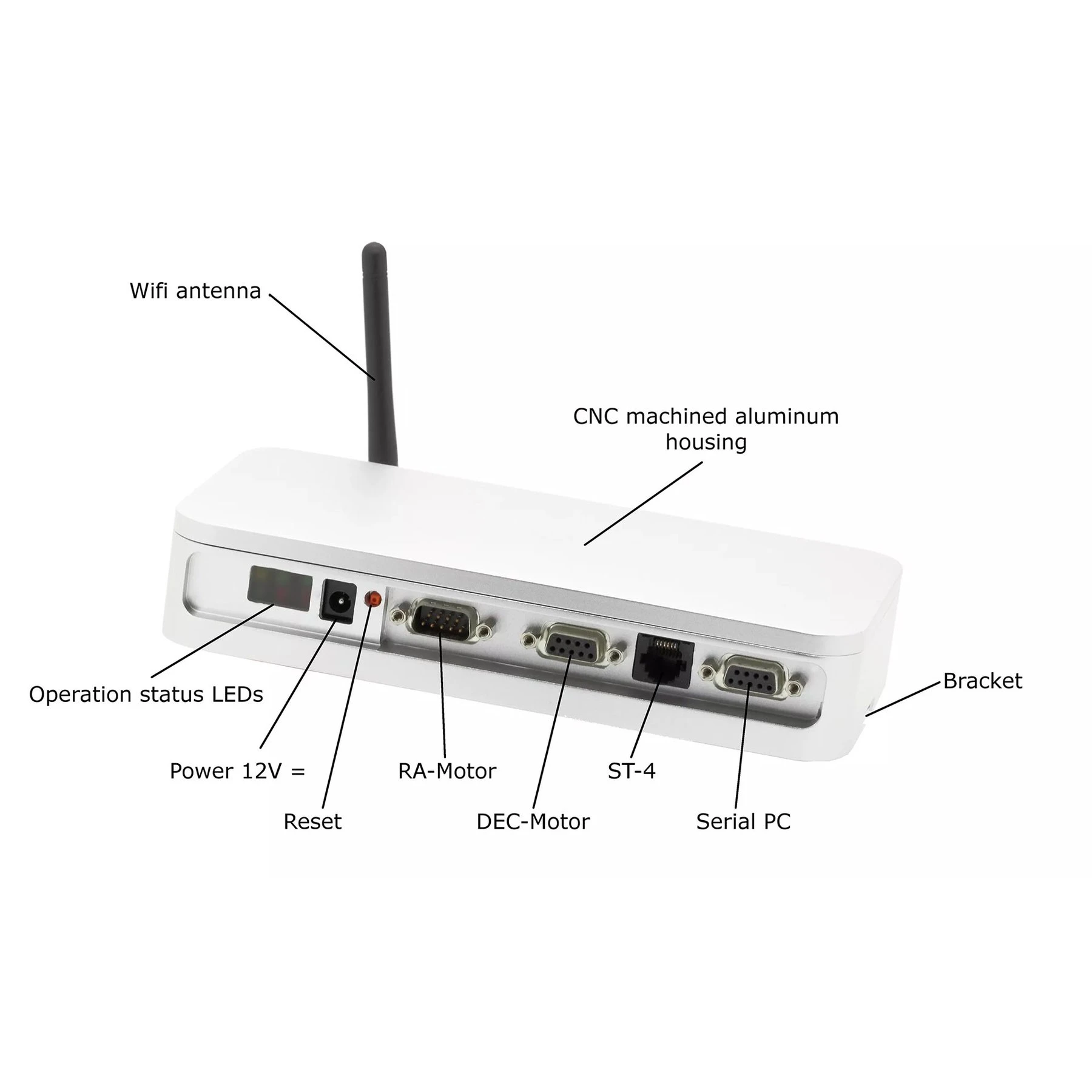 Мощен контролер с Open GoTo за персонализиране . В основата на контролера е напълно автономен 2-канален мултипроцесор с 8 процесора и Wi-Fi Ethernet 10/100 адаптер с IP функционалност. Тази конфигурация позволява дистанционно управление чрез браузър, ASCOM, приложение или серийна връзка. Open GoTo ви позволява да пишете и зареждате персонализиран фърмуер в контролера, което улеснява индивидуалните настройки на функциите на устройството, както и създаването на персонализирани списъци с обекти.