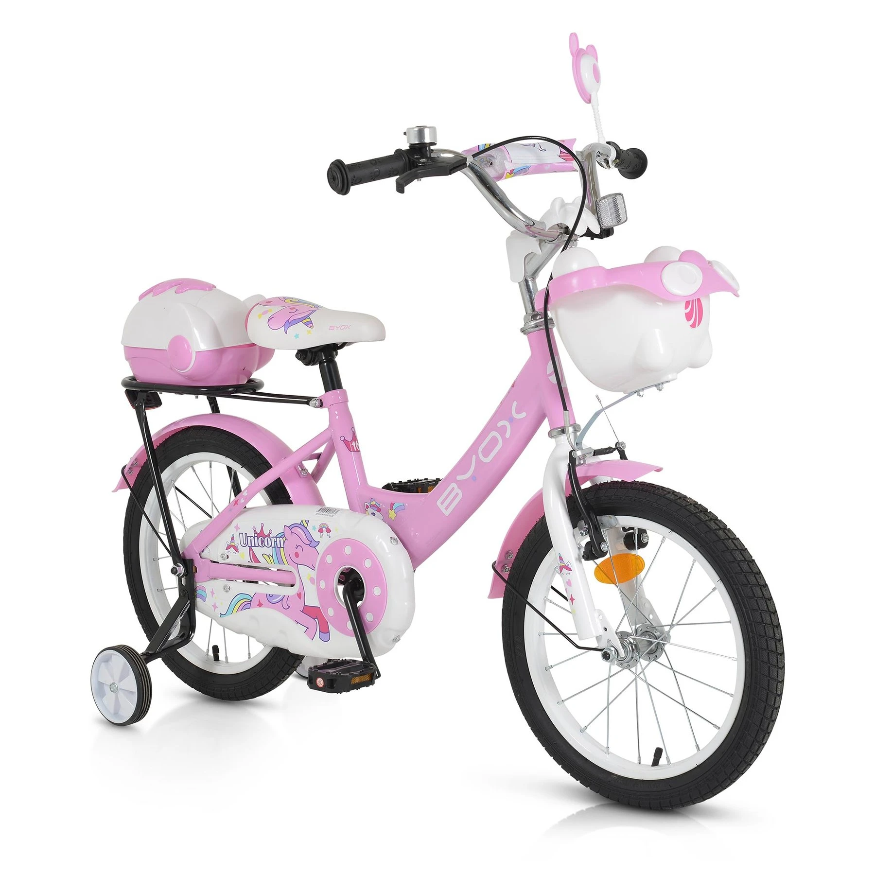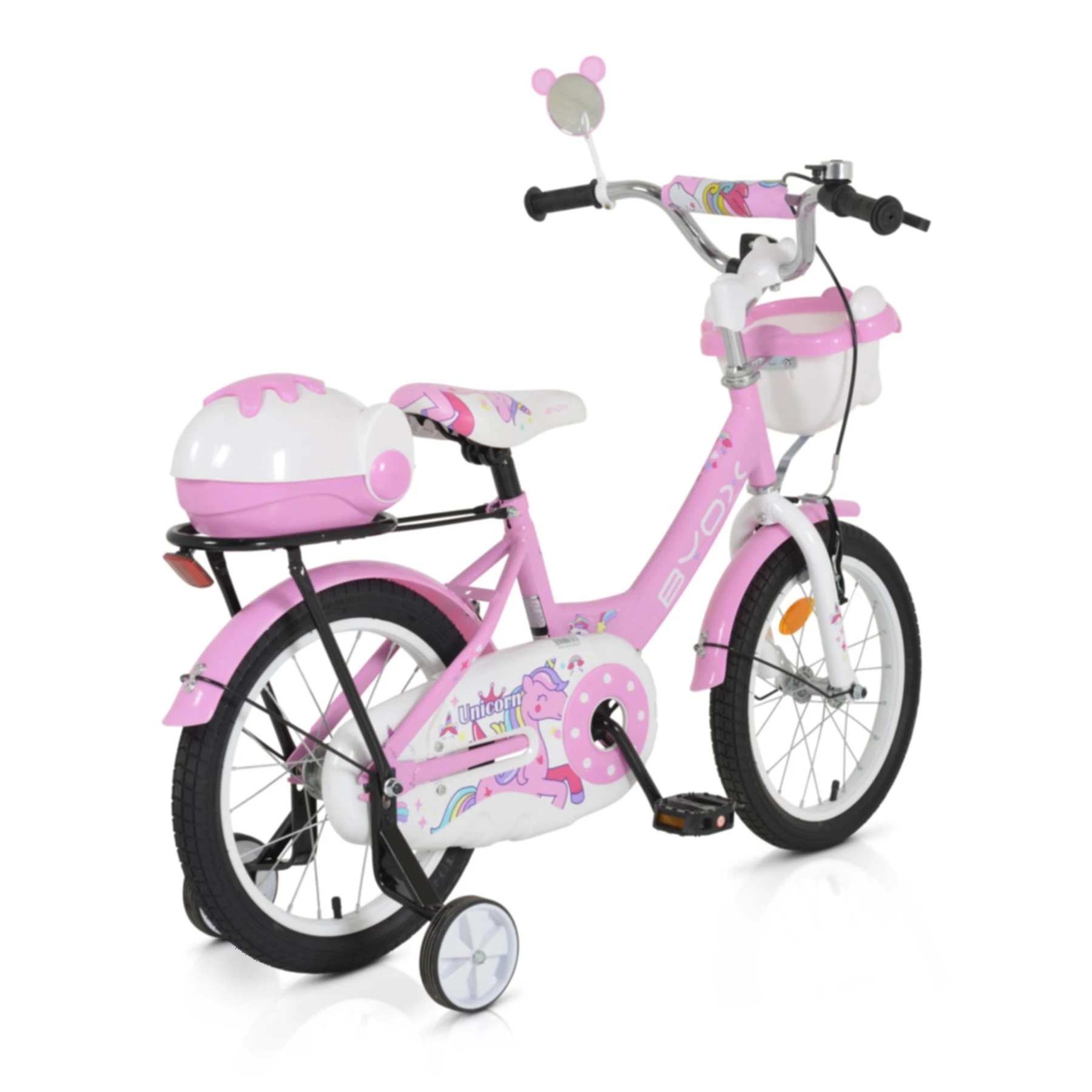 Велосипедът е оборудван с помощни колела, звънец, огледало, пластмасови калници, преден и заден кош.