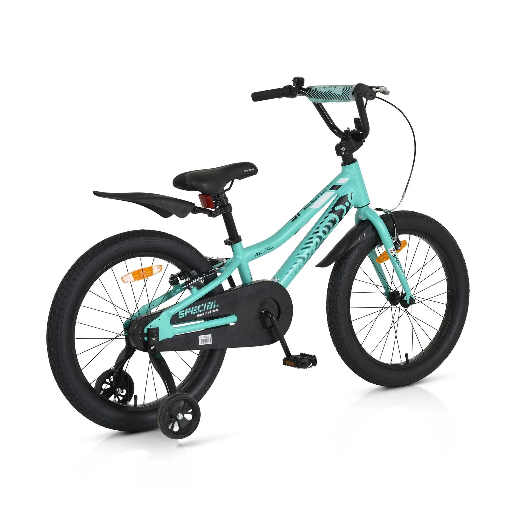 Детският велосипед е оборудван с помощни колела, звънец и луксозни калници. Подходящ за разходка в градски паркове и пътища с настилка, за деца на възраст от 6 до 10 години, с височина от 115 до 135 cm.