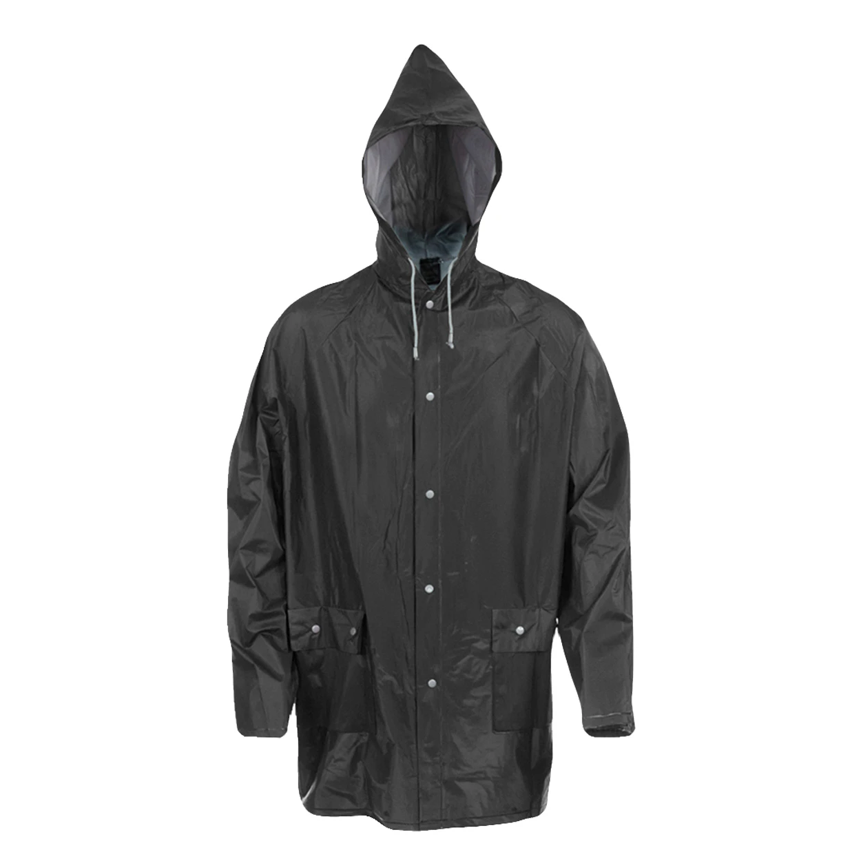 Дъждобран с качулка, изработен от устойчиво PVC, с термозапечатано покритие.