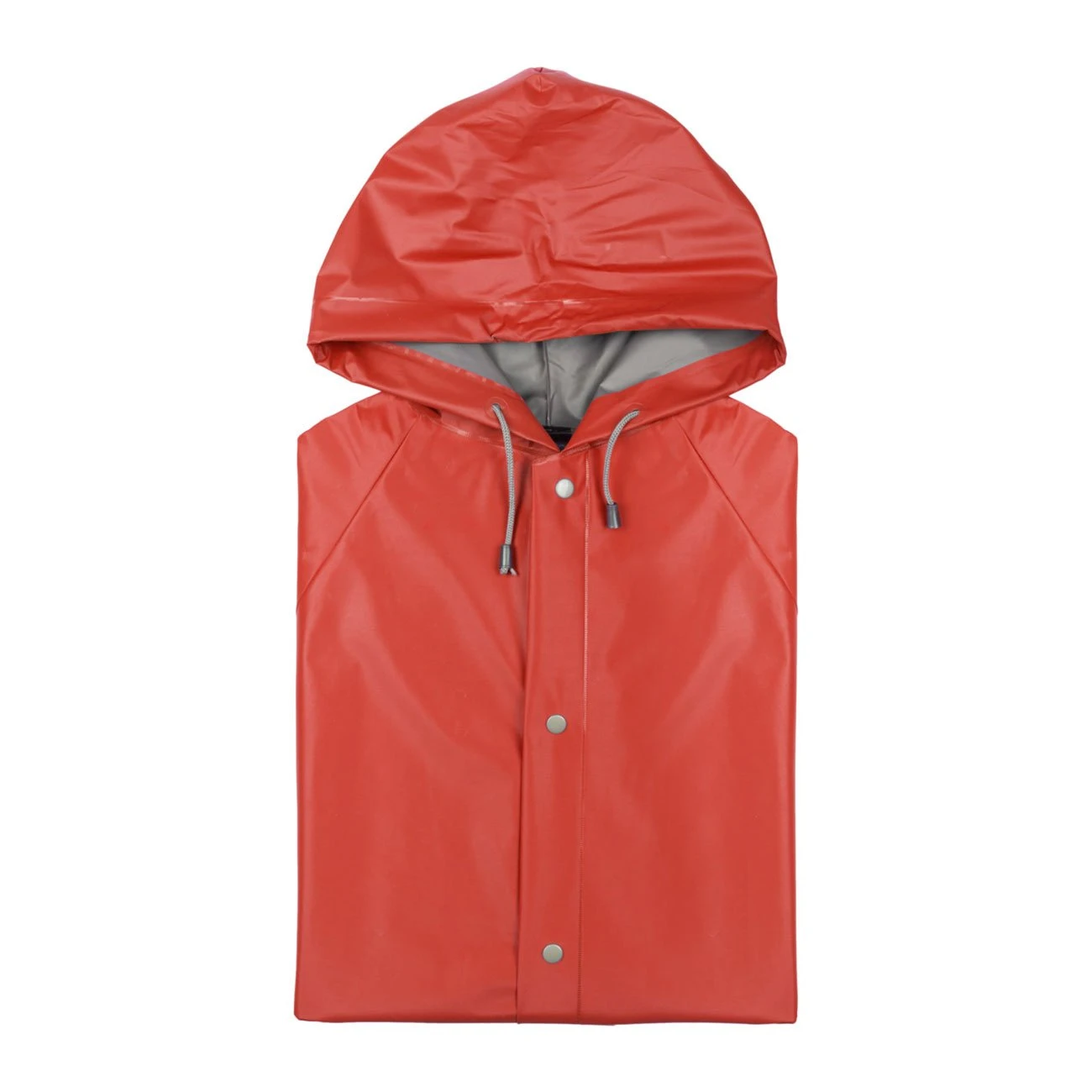 Дъждобран с качулка, изработен от устойчиво PVC, с термозапечатано покритие.