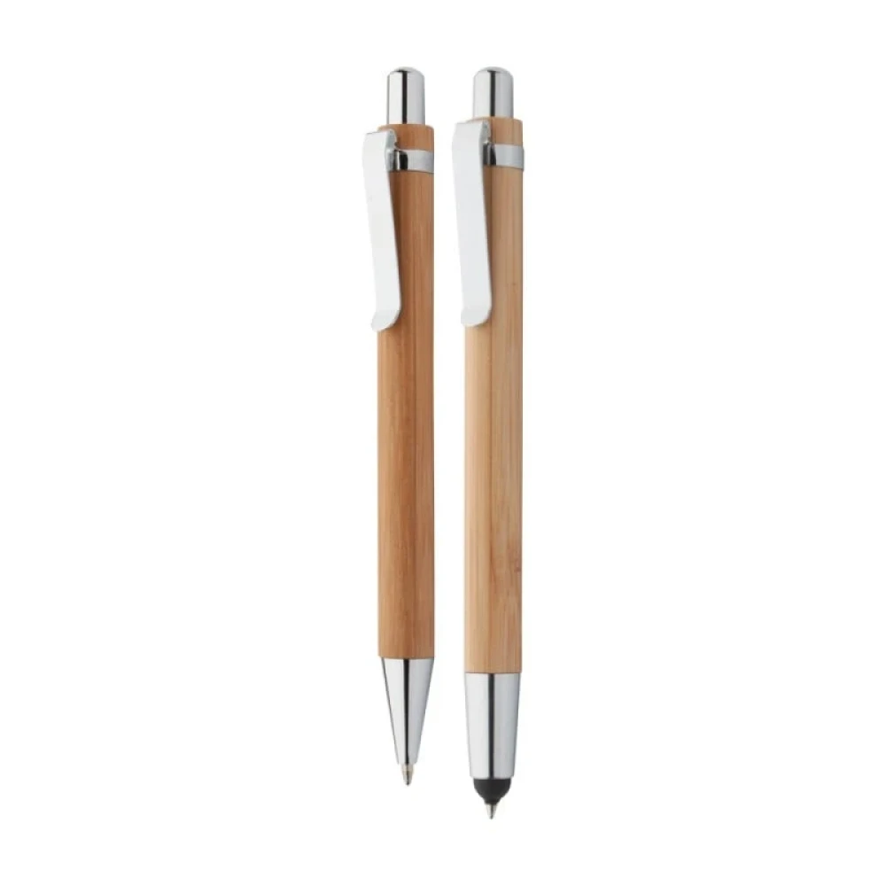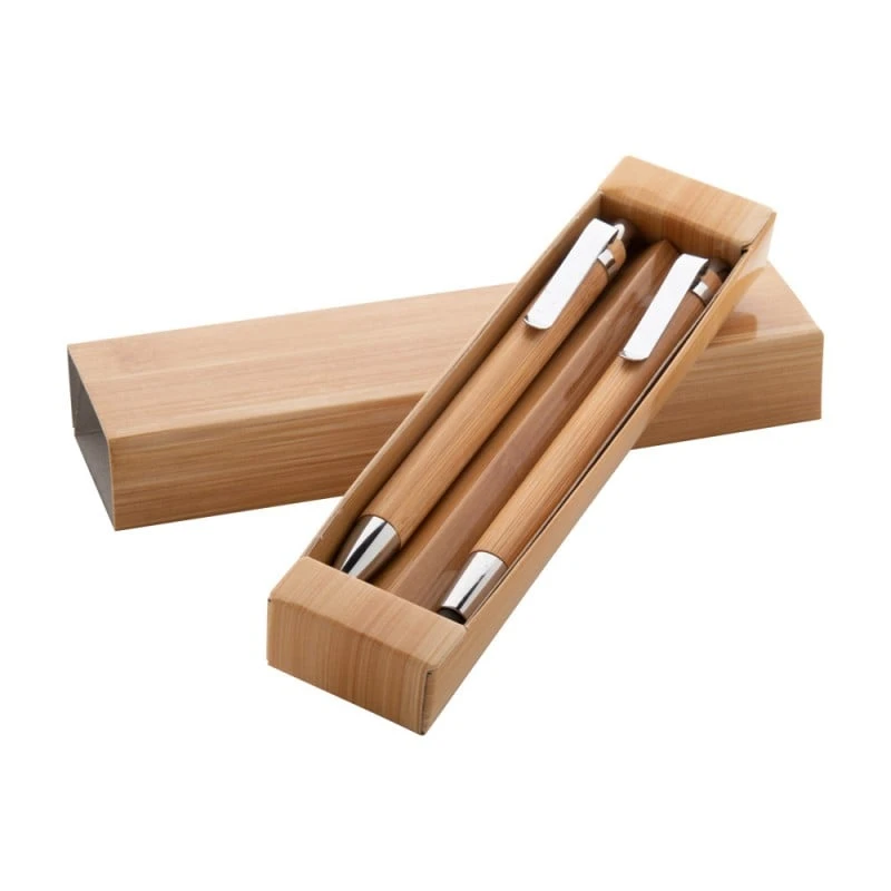 Комплектът включва бамбукова химикалка с тъч връх и автоматичен молив с 0.7 mm графит, поднесени в изискана подаръчна кутия.