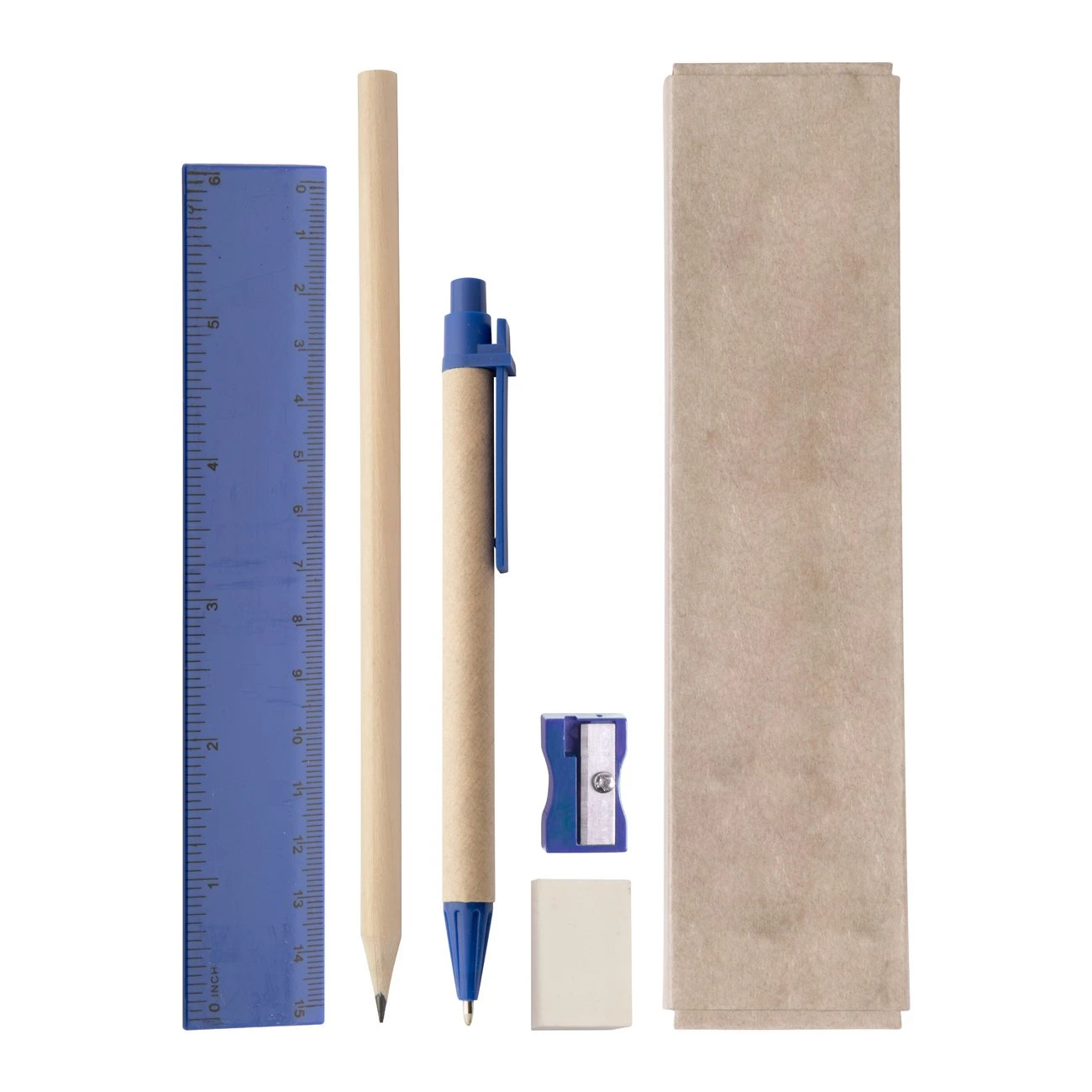 Включва: химикалка от рециклирана хартия (със син пълнител), молив, линийка, острилка и гумичка.