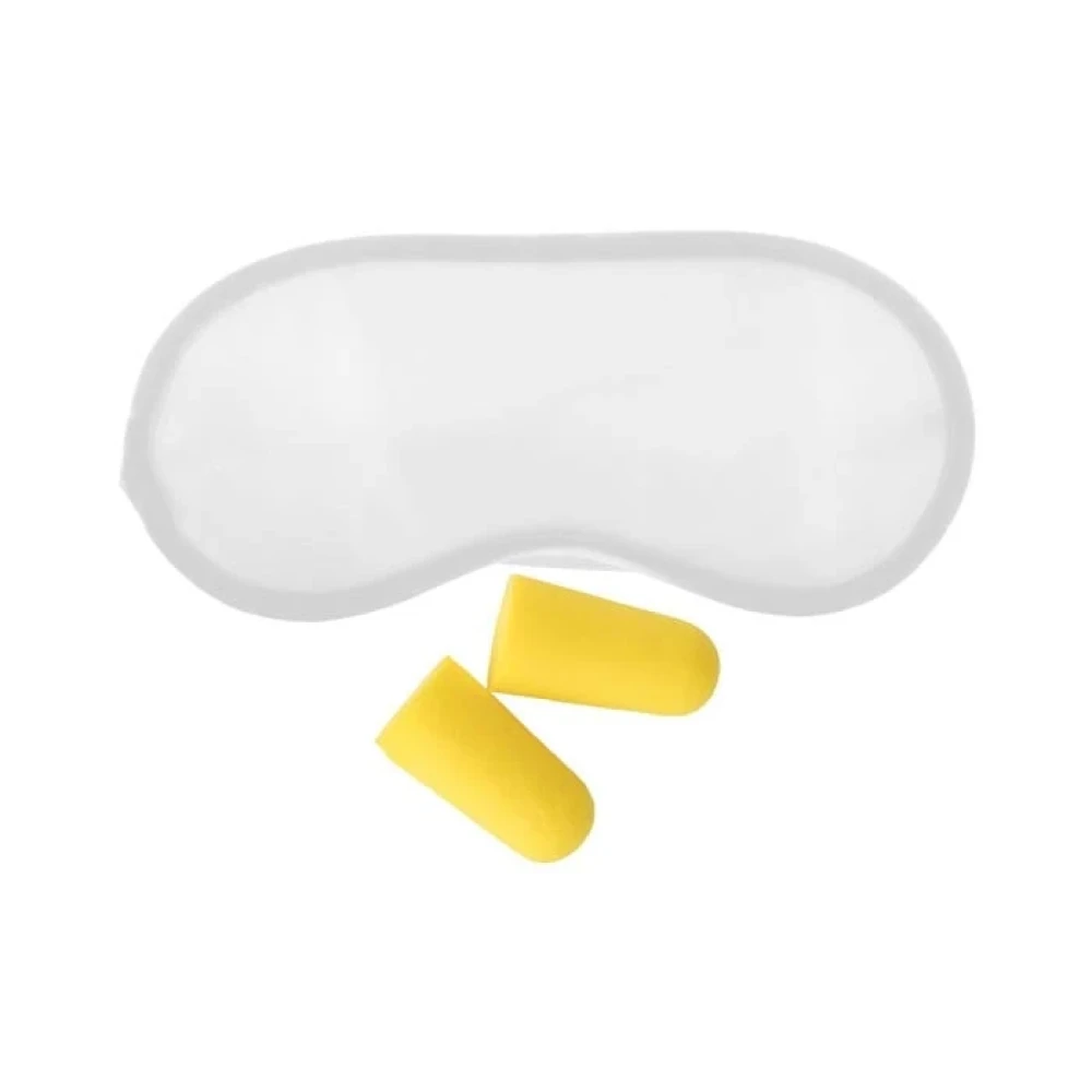 Комплект за пътуване, включващ маска за очи от микрофибър и тапи за уши от EVA.