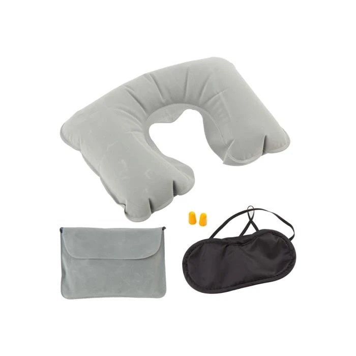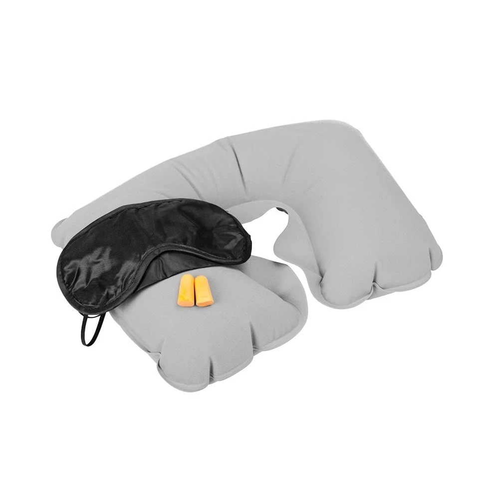 Комплект за пътуване, включващ надуваема възглавница за път, маска за очи и тапи за уши.
