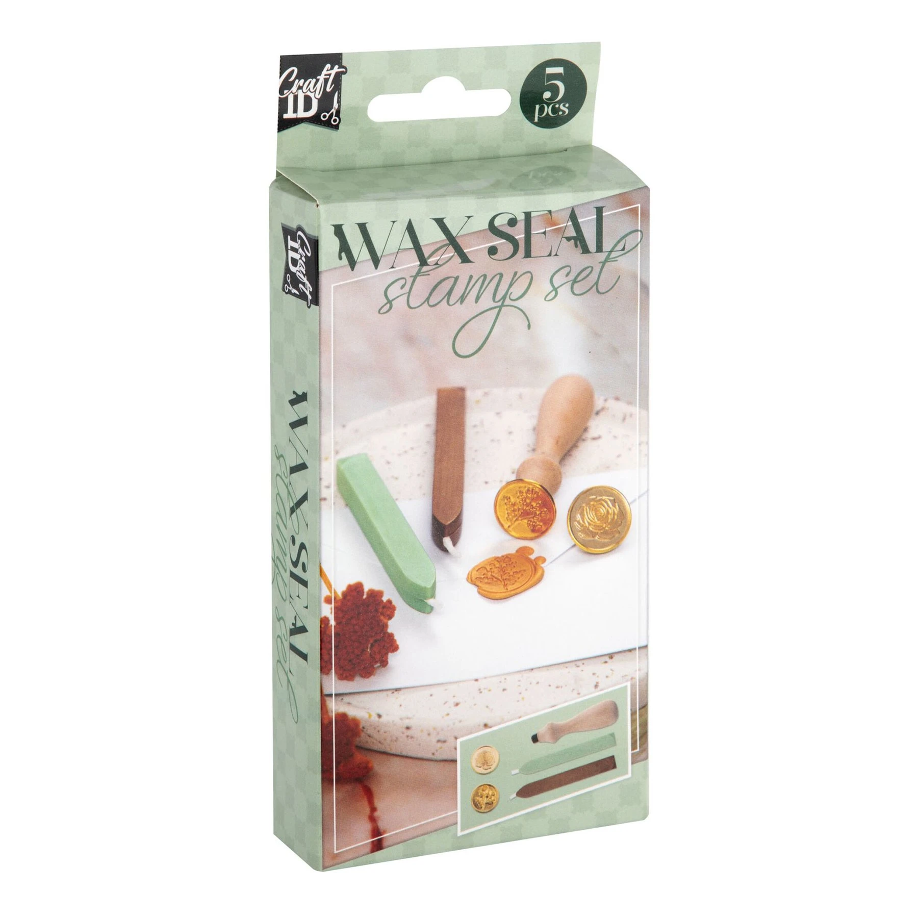 Подходящ както за начинаещи, така и за любители на ръчните декорации, комплектът включва удобна дръжка, два метални печата с флорални мотиви и два восъчни стика в различни цветове.