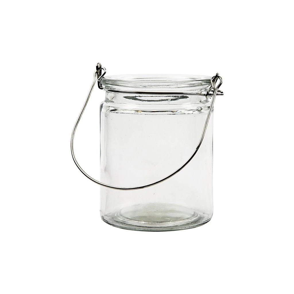 Цилиндричен фенер от стъкло с метална дръжка.