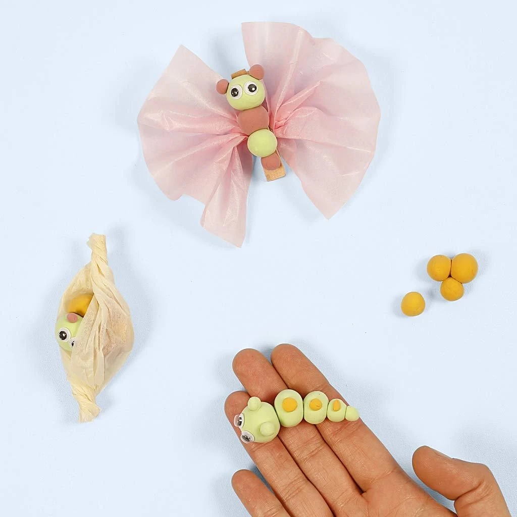 Използвай мека Silk Clay глина в три различни цвята, за да оформяш яйце, гъсеница, какавида и красива пеперуда.