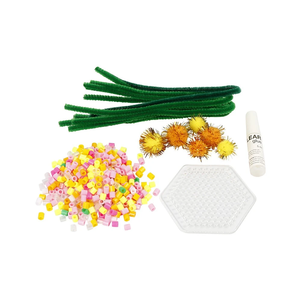 Съдържание: мъниста в 7 различни цвята, плоча за мъниста, меки стъбла, помпони и лепило.