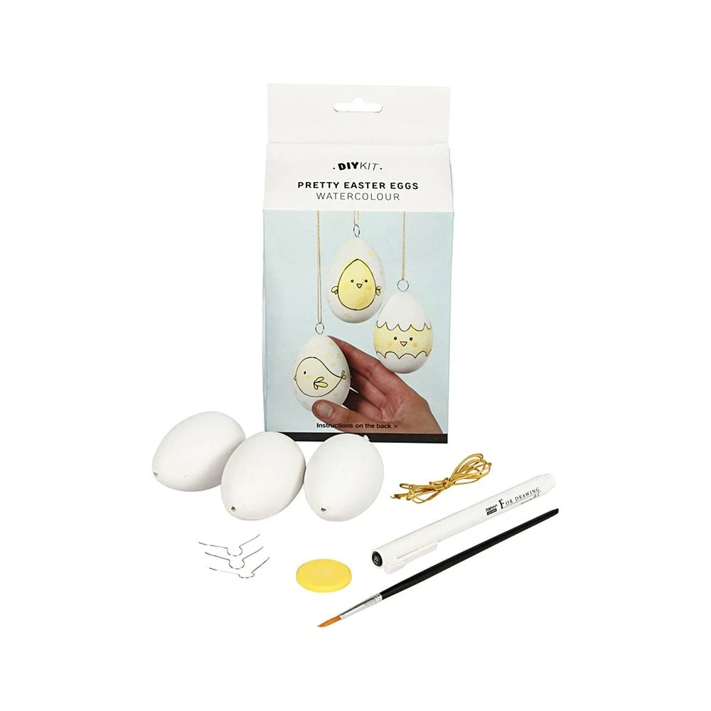 Съдържание: 3 пластмасови яйца, 1 жълта акварелна боя, 1 четка, маркер, кукички и връв.