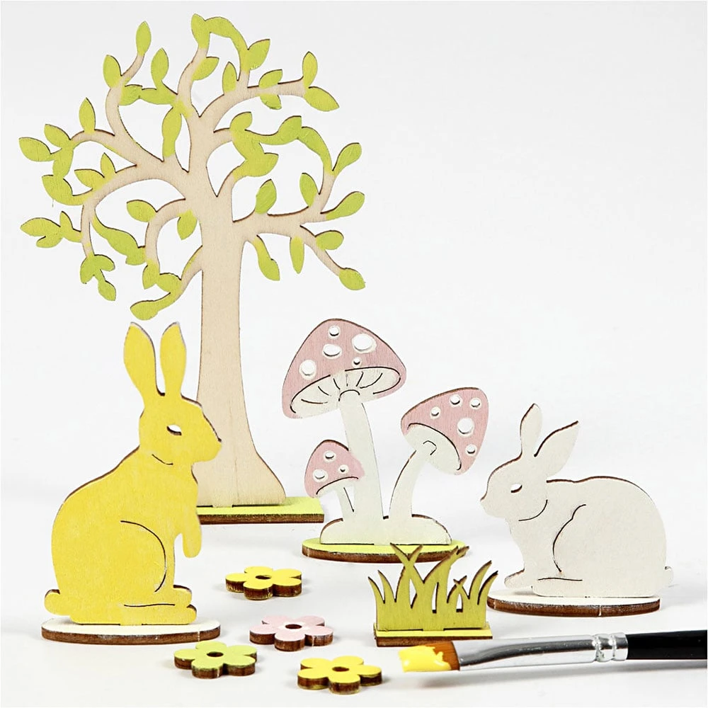 Дървен шаблон от фигури с фини детайли на дърво, цветя и зайци.