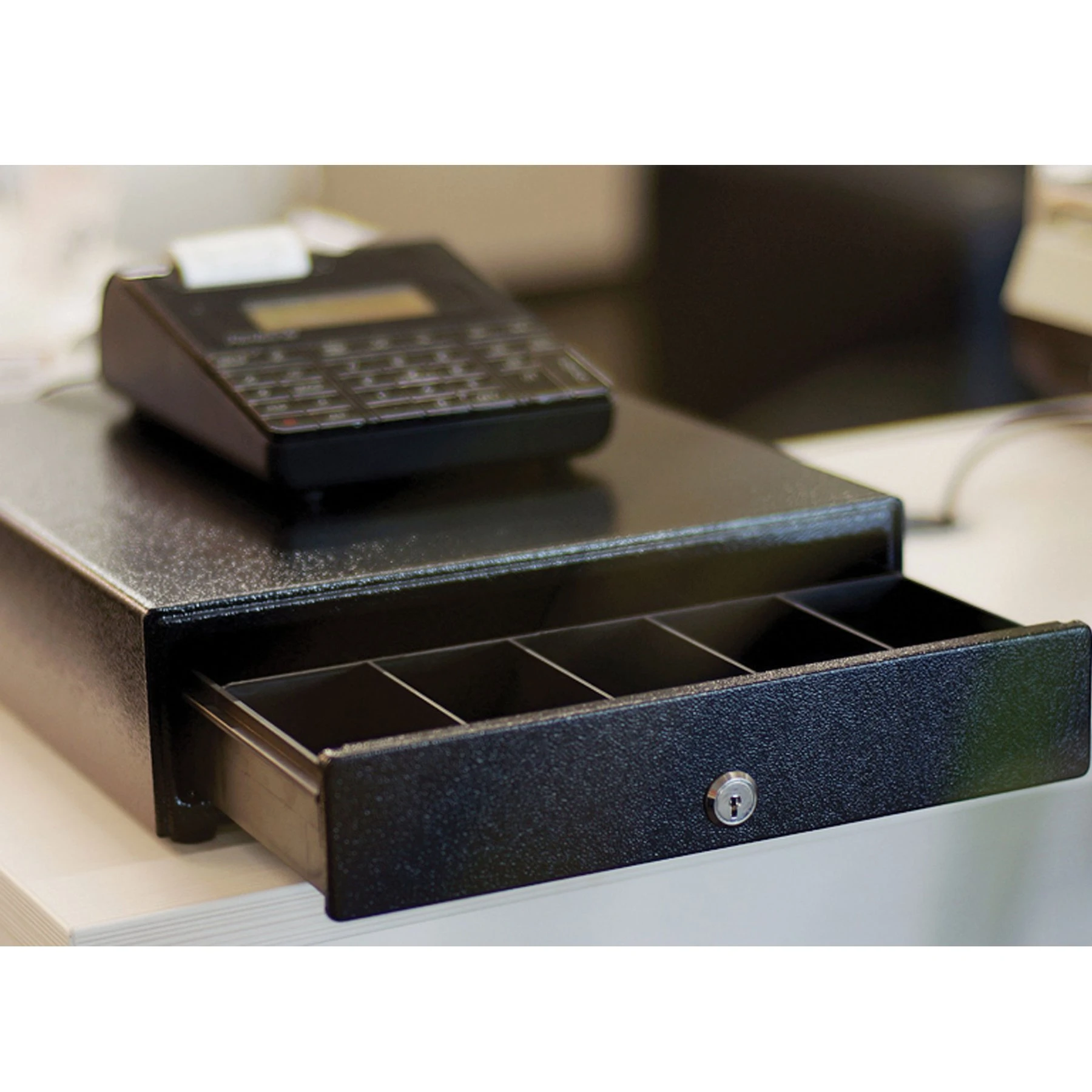 Черен метален сейф за каса Daisy. Притежава 4 отделения за банкноти и 5 отделения за монети.