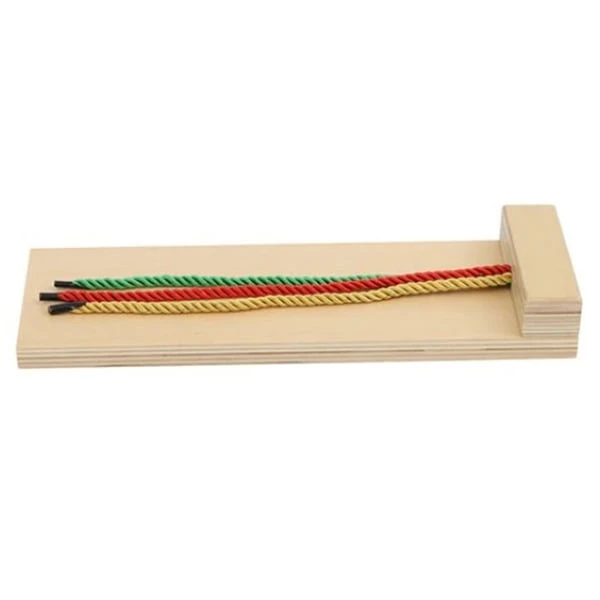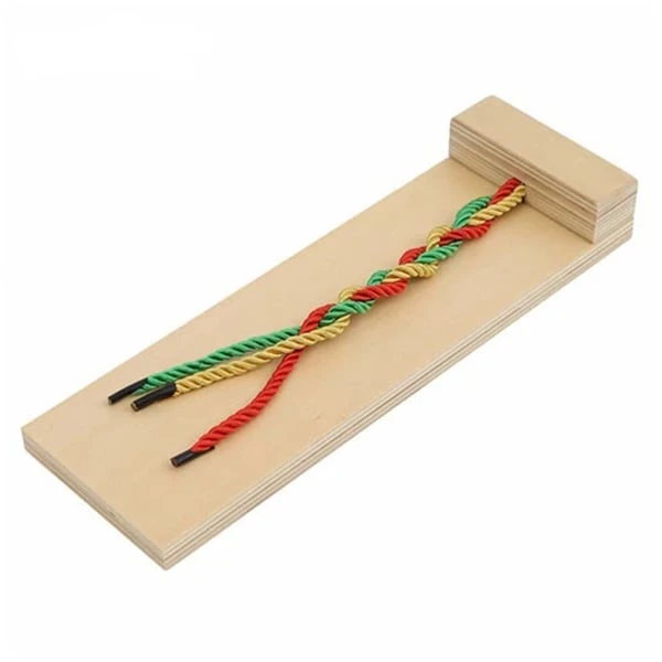 Дървена основа, върху която има 2 текстилни връвчици. Този материал учи децата как да сплитат плитки. Способността за сплитане на плитки не е само за момичета, това е чудесна задача и за двата пола.