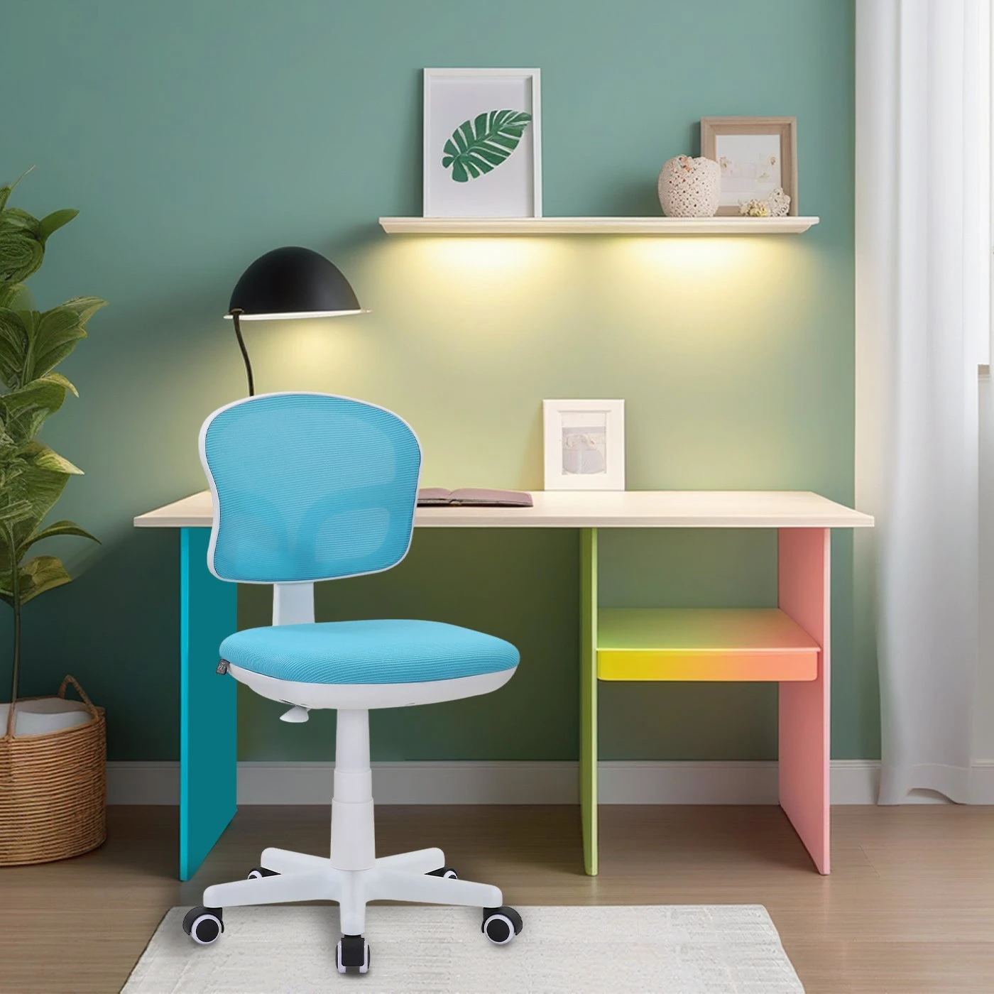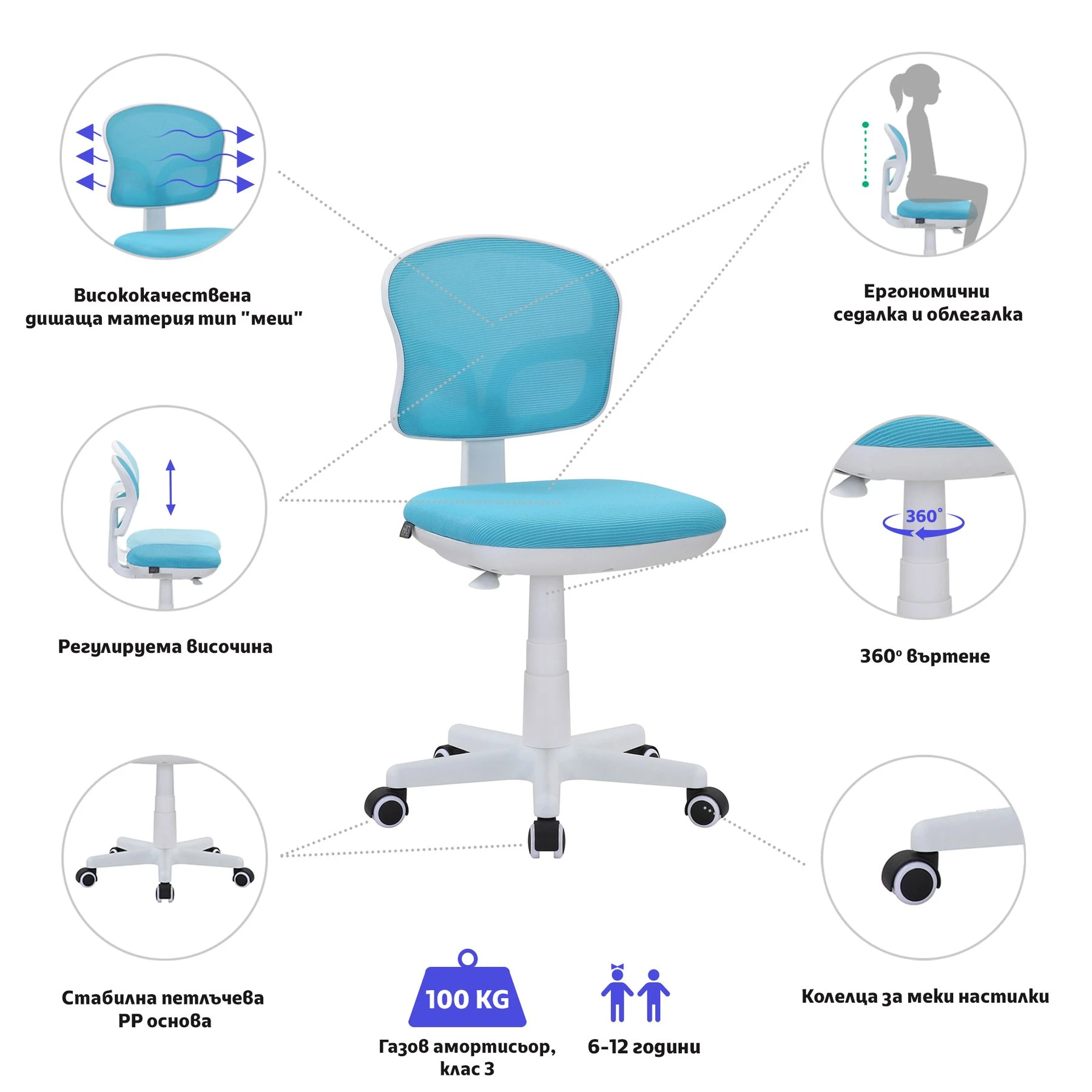 Ергономичен детски стол с анатомични седалка и облегалка, тапицирани с дишаща материя тип ''меш''.