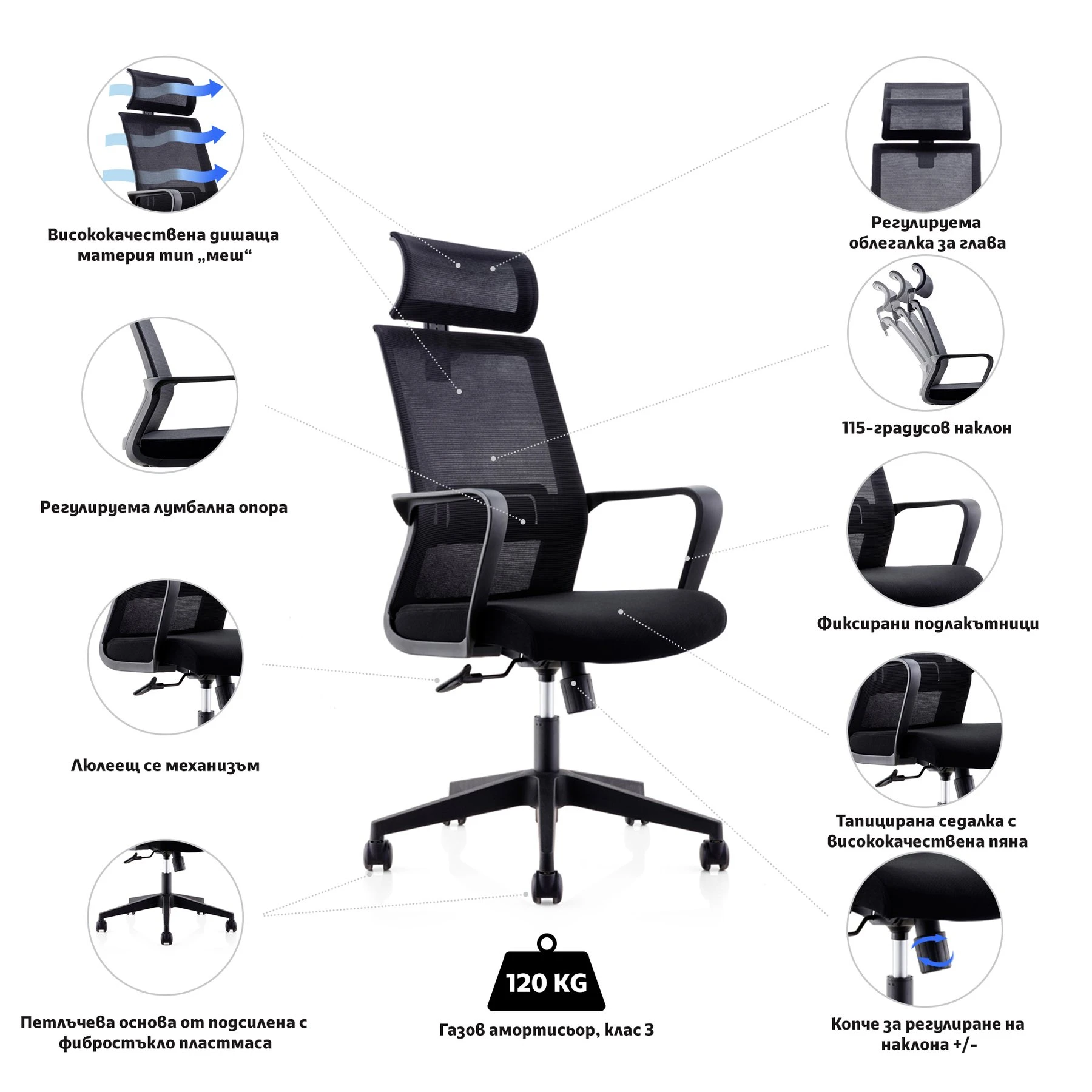 Облегалката е изработена от дишаща материя тип „меш“, която позволява на въздуха да циркулира и поддържа температурата на тялото, като елиминира загряването и дискомфорта.