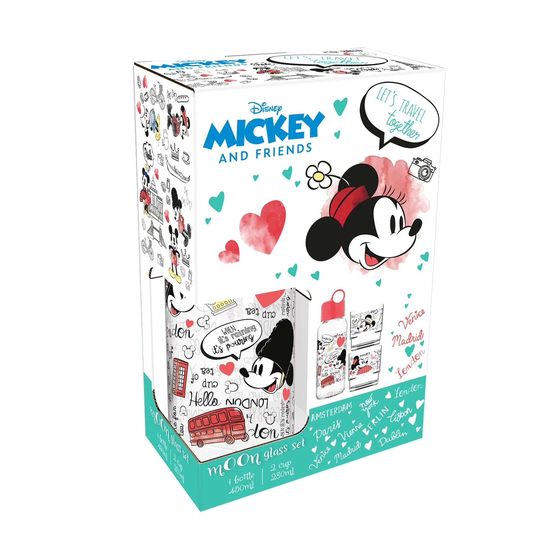 "Disney" комплект, съдържащ стъклена бутилка за вода и 2 чаши.