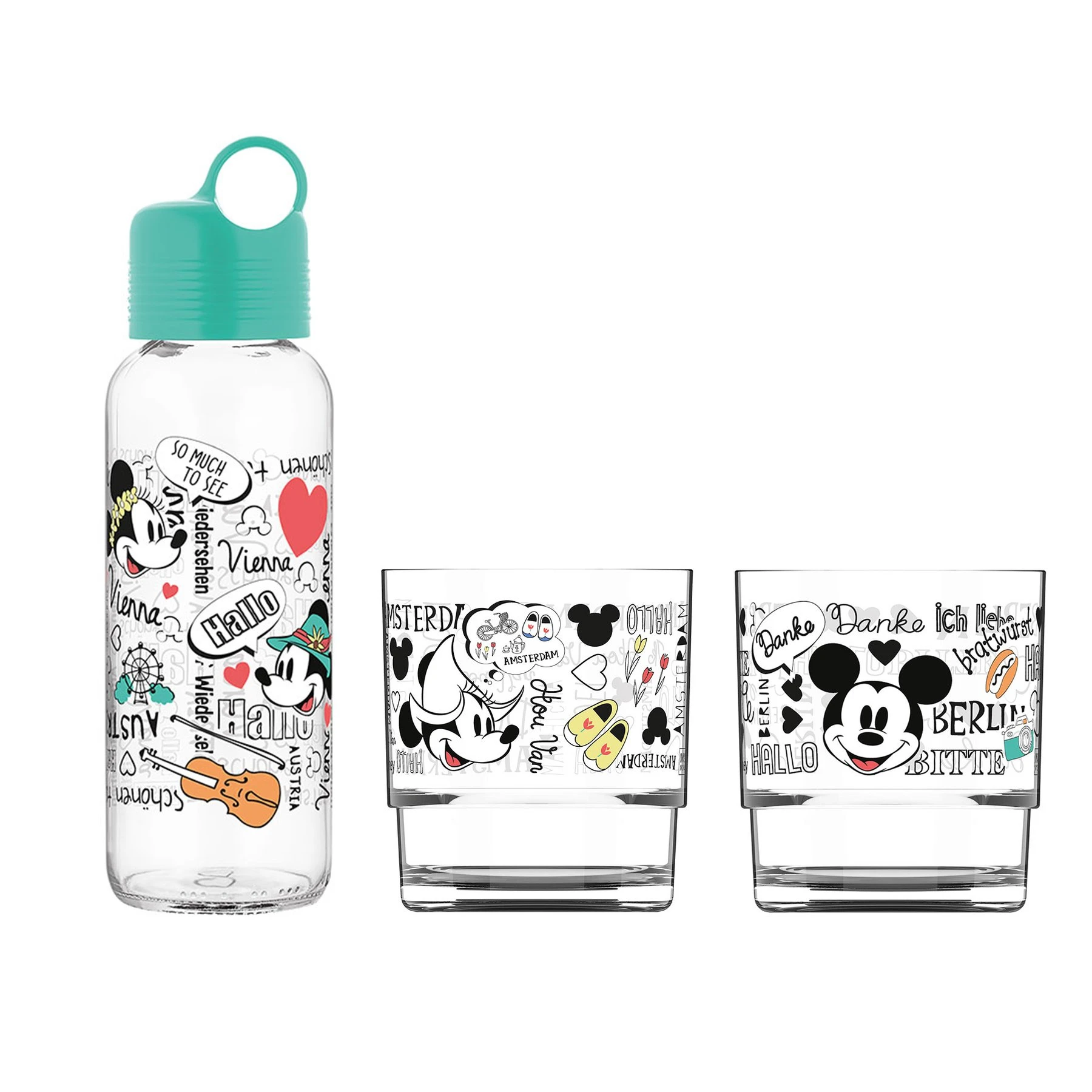 "Disney" комплект, съдържащ стъклена бутилка за вода и 2 чаши.