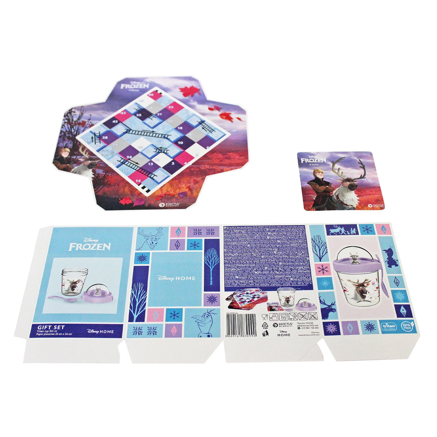 Подаръчен комплект с любимите ви Disney герои, който безспорно ще зарадва всеки малчуган! В опаковката ще откриете: - Висококачествена чаша, изработена от тритан, с лъжичка и капак с 3D фигурка на Disney герой. Вместимост: 350 ml; -Игрално поле за настолни игри; - Зарче тип „направи си сам“; - Книжка за оцветяване, разположена от вътрешната страна на опаковката; - Подложка за чаша.