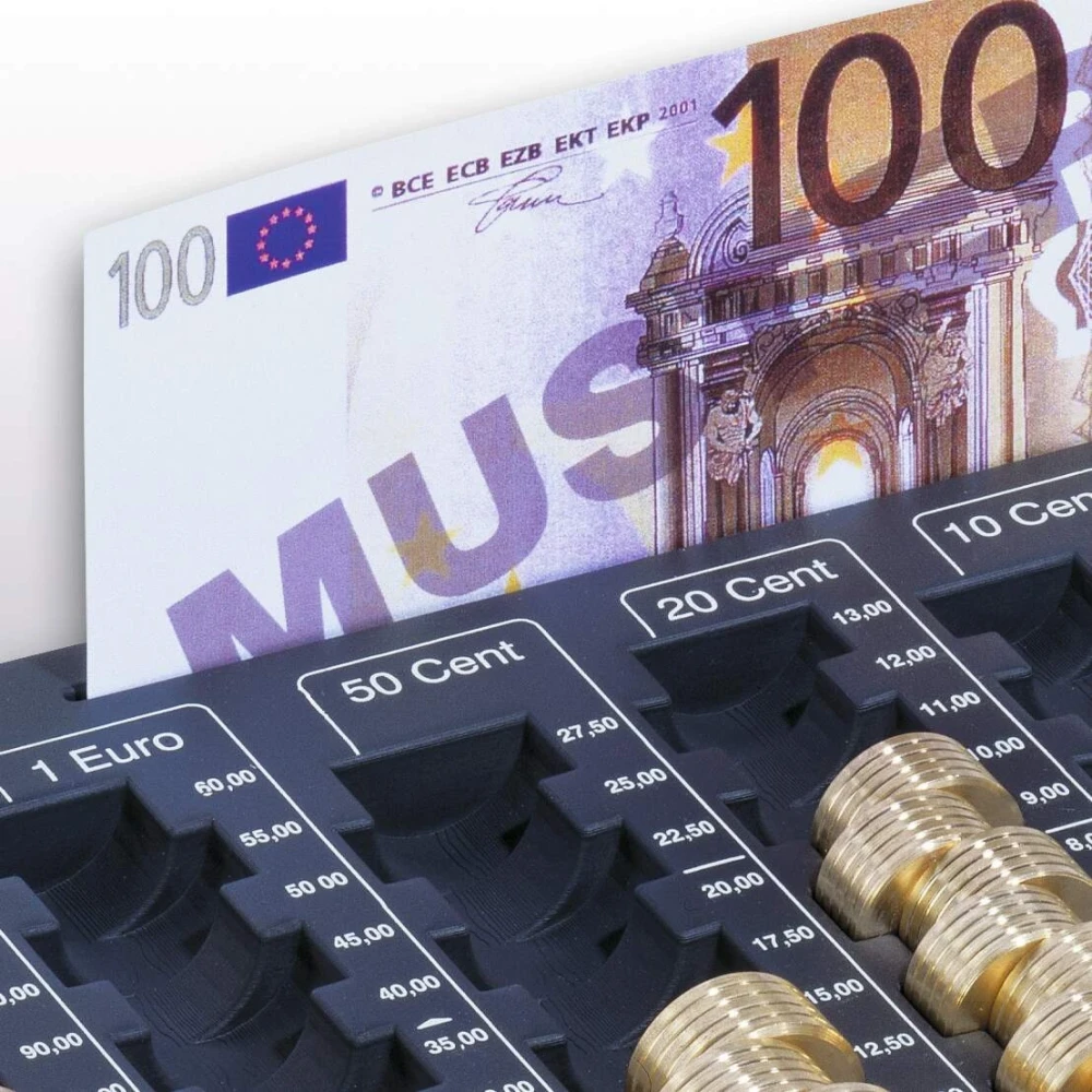 Разполага с 8 отделения за подреждане за всички купюри монети от центове и евро, и допълнително отделение за банкноти за временно съхранение.