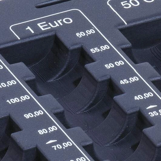 Предоставя ясен и бърз преглед на паричните средства, благодарение на шахматно разположените отделения за монети. Подредените отделения помагат на касиера бързо да различава номиналите.