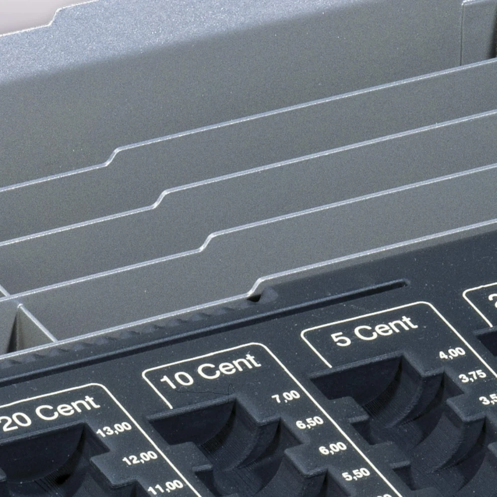 Предоставя ясен и бърз преглед на паричните средства, благодарение на шахматно разположените отделения за монети. Подредените отделения помагат на касиера бързо да различава номиналите.