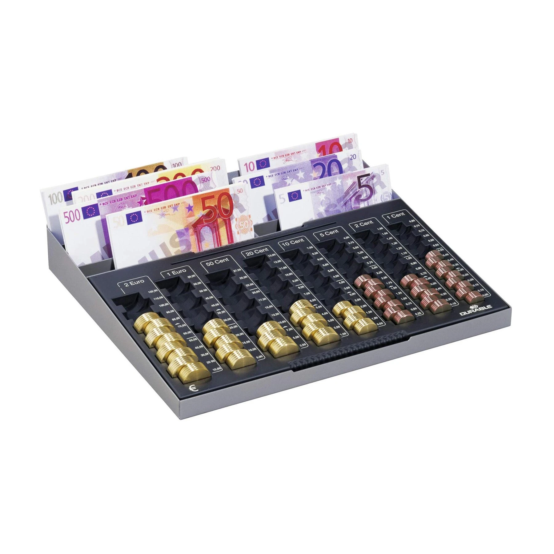 Монетникът на Durable е висококачествен, функционален и устойчив. Подходящ за сортиране на евромонети и банкноти – перфектен избор за професионални среди, които изискват прецизност, бързина и стабилност в обслужването.