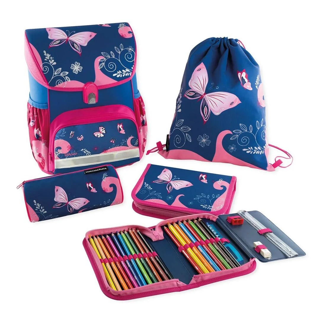 Комплектът включва раница, спортна чанта, несесер тип ролка и пълен несесер с ученически пособия.