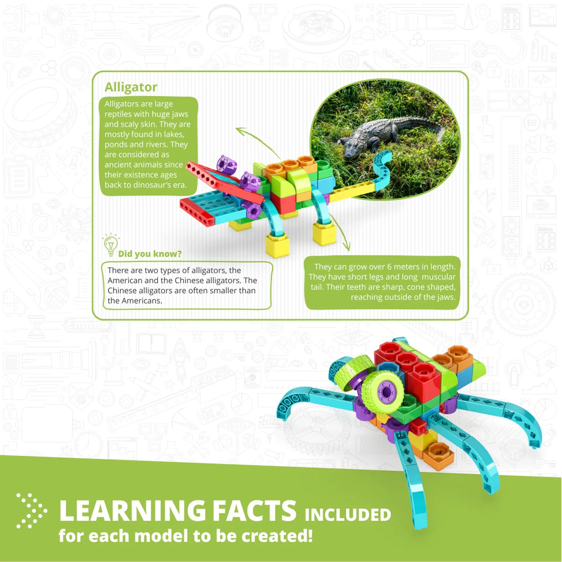 STEM конструктор под формата на алигатор. Като бонус, в опаковката са включени още 5 модела за направа на различни животни и превозни.
