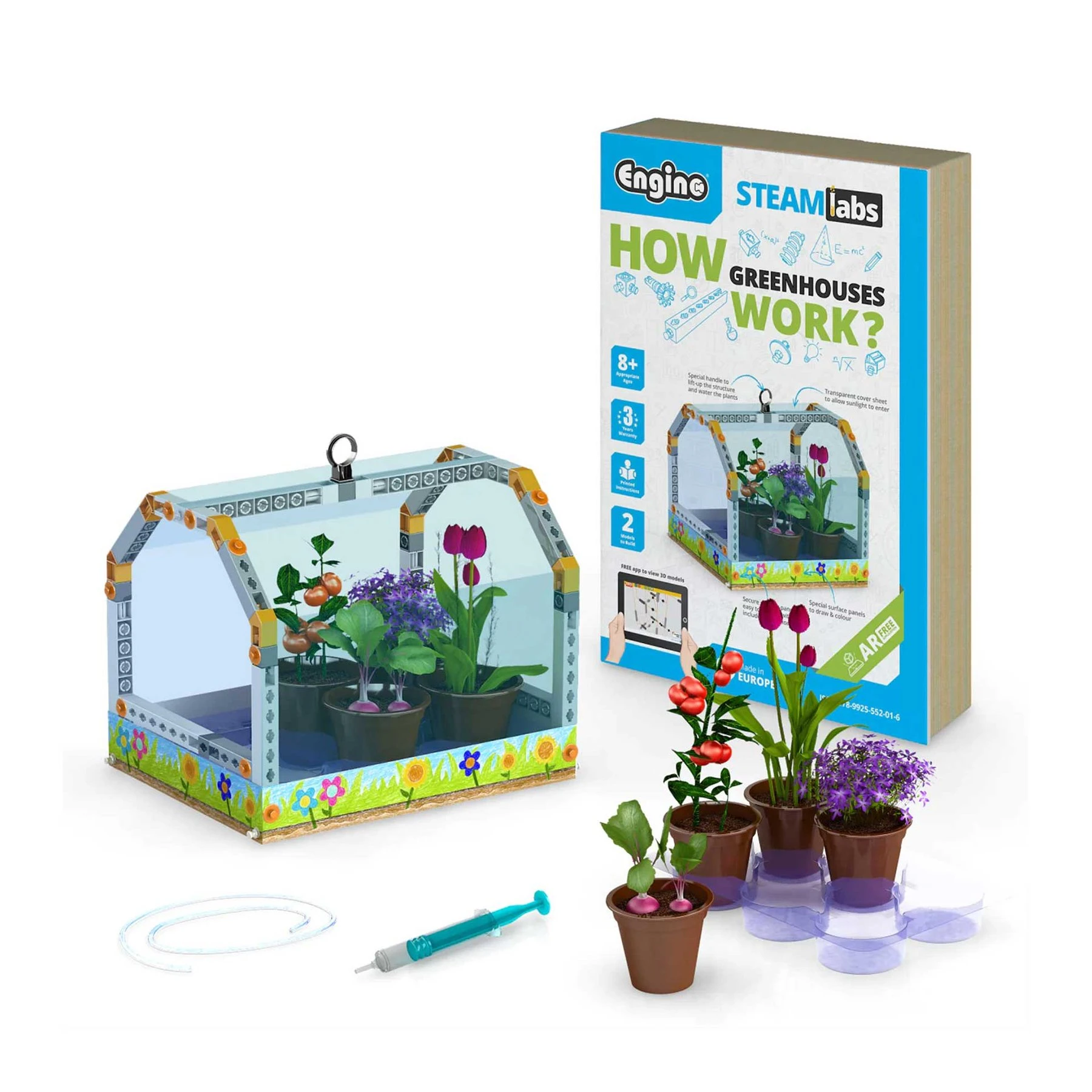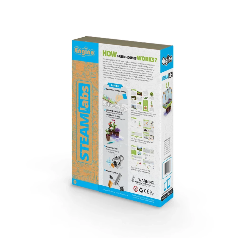 Младите ботаници могат да отглеждат свои собствени растения от семена в напълно функционална оранжерия, която изграждат сами с този комплект играчки STEAM! Експериментите ще покажат на малките фермери как условия като светлина, температура и влага влияят на реколтата им.