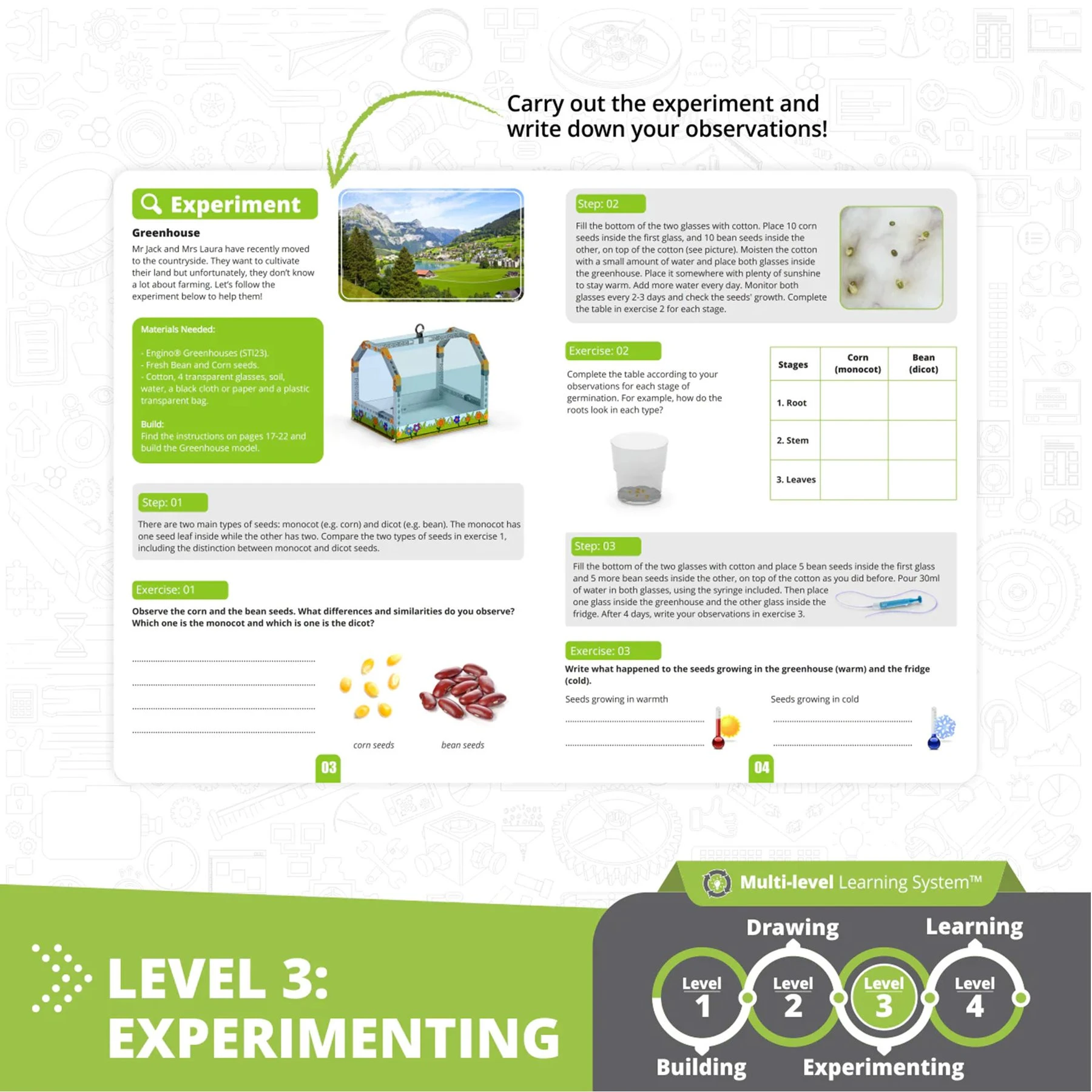 - микроистория на селското стопанство, пълна със забавни факти; -практически STEM експерименти със собствени семена от царевица и боб; -тест, за да проверите разбирането им на ключови STEM концепции; -лесни за следване инструкции за изграждане; -елементи за печат, за да практикуват дизайнерските си умения.