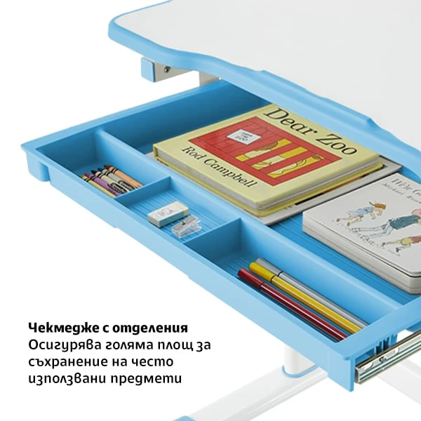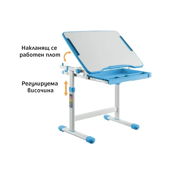 Ръчното регулиране на височината на повдигане е лесно, а накланящият се работен плот осигурява оптимален ъгъл за комфорт при писане, четене и рисуване.