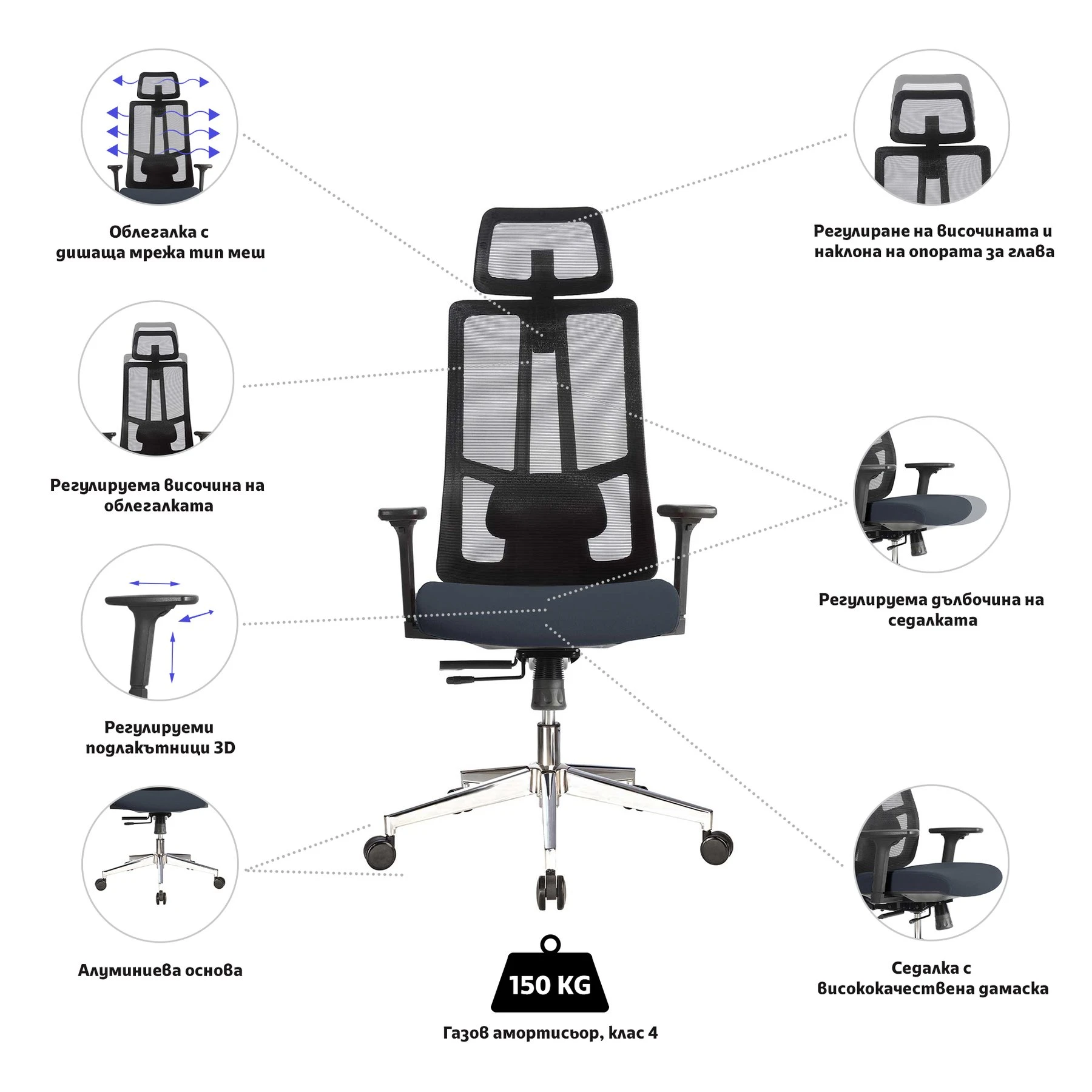 Облегалката е прецизно тапицирана с дамаска тип „меш“, която позволява на въздуха да циркулира свободно и предотвратява изпотяването и дискомфорта през горещите дни.