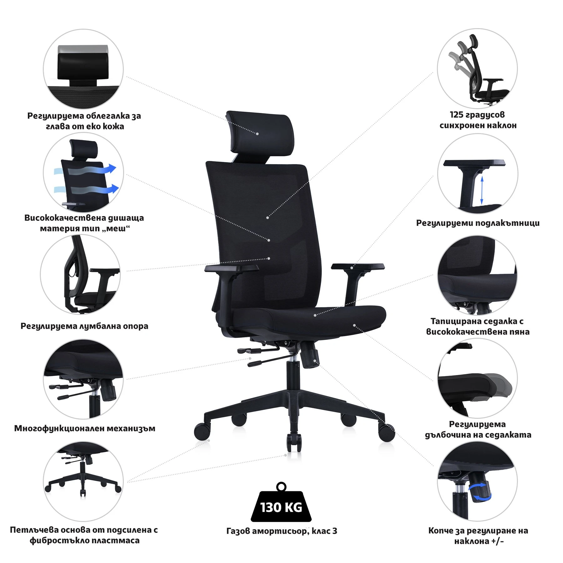 Височината и ширината на облегалката допринасят за правилната позиция на тялото и поддържат гръбначния стълб изправен. Това намалява риска от появата на болки и статичното натоварване на мускулите. Към стола е добавена допълнителна опора за главата, тапицирана с еко кожа, както и лумбална опора, чиято цел е да осигури опора на кръста и гърба.