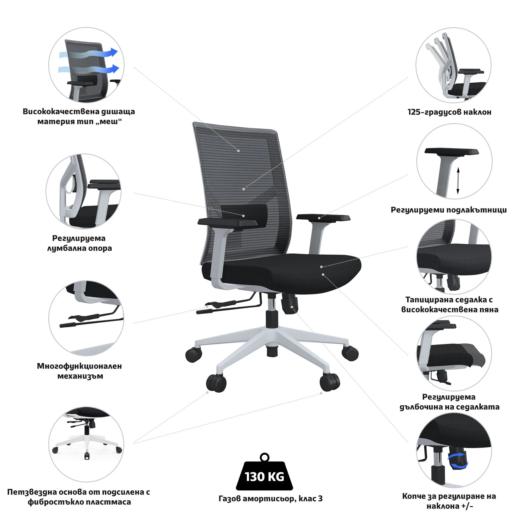 Пренесете комфорта на работното място с работен стол RFG Snow W! Заложете на стил и качество само с един продукт! Ако и вие сте от хората, които работят в седнало положение дълго време, трябва да помислите до какви последствия води това и как да помогнете на тялото си да запази най-добрата си форма! Благодарение на лумбалната опора, столът поддържа долната извивка на гърба и запазва идеалната S-образна форма на гръбнака. Тя ще елиминира чувството на умора и болките в кръста и ще Ви даде възможност да се насладите максималното на всеки постигнат успех. Открийте перфектния ъгъл на облегалката и я заключете в най-удобната за Вас позиция! Естествената позиция на седене осигурява опора за бедрата и гръбнака, в следствие на което те стоят свободно и осигуряват свободното циркулиране на кръвта през цялото тяло. Когато искате да релаксирате, просто се отпуснете назад и се отдайте на заслужена почивка! Облегалката е изработена от дишаща материя тип „меш“, която позволява на въздуха да преминава свободно през нея и предотвратява изпотявате и дискомфорт.