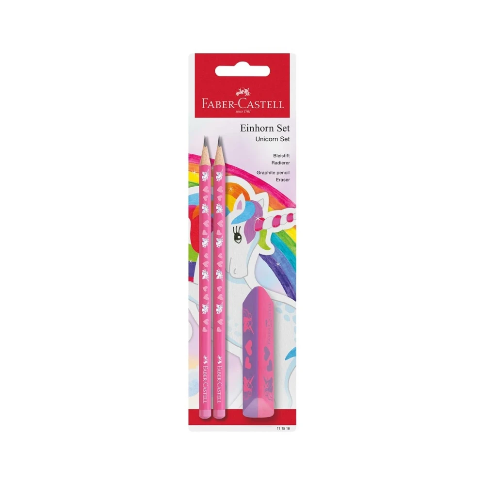 Създайте магия с моливите на Faber-Castell! Комплектът съдържа два НВ молива с вълшебен дизайн на еднорози и удобна гума за корекции.