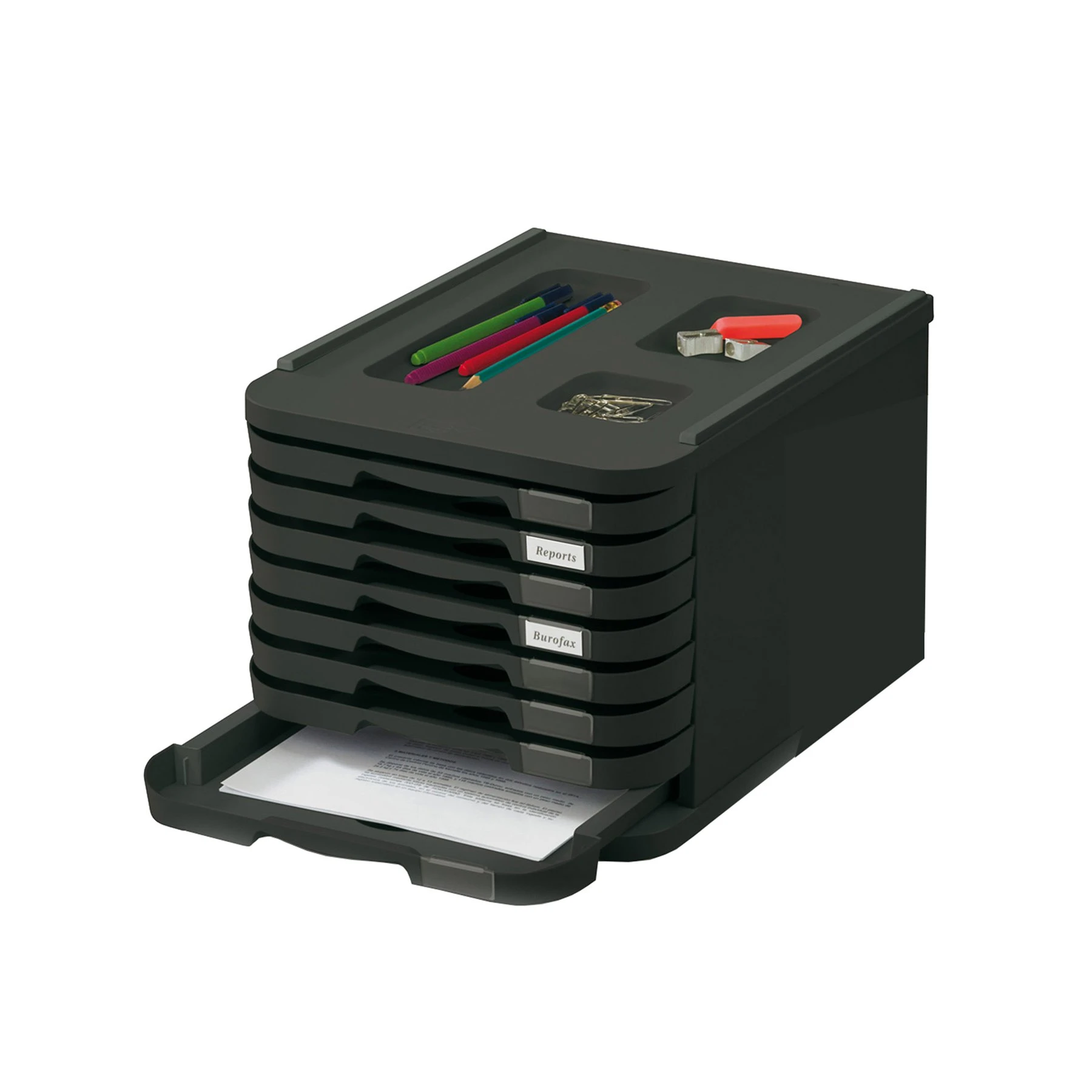 Практичен бокс с 8 чекмеджета за съхранение на документи с максимален формат А4, изработени от висококачествена пластмаса.