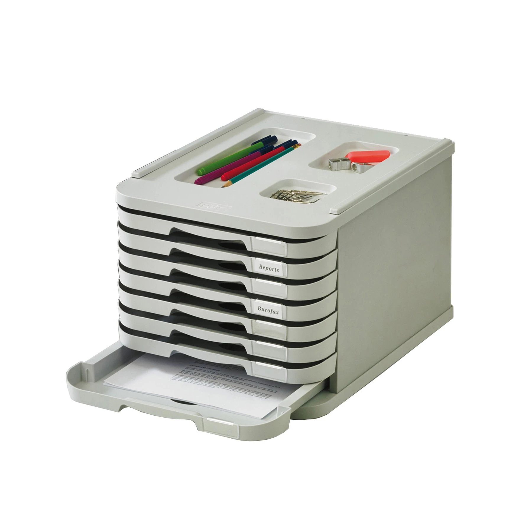 Практичен бокс с 8 чекмеджета за съхранение на документи с максимален формат А4, изработени от висококачествена пластмаса.