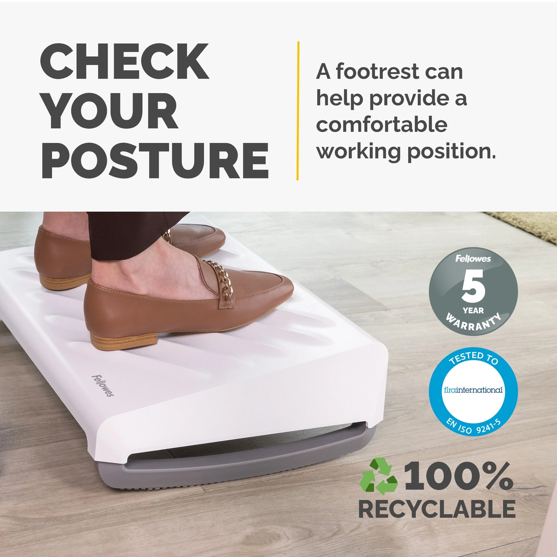 Поставка за крака Fellowes Breyta има голяма платформа с 3 степени на регулиране на височината, за да осигури ергономична стойка. Опцията за люлеене увеличава циркулацията и намалява умората.