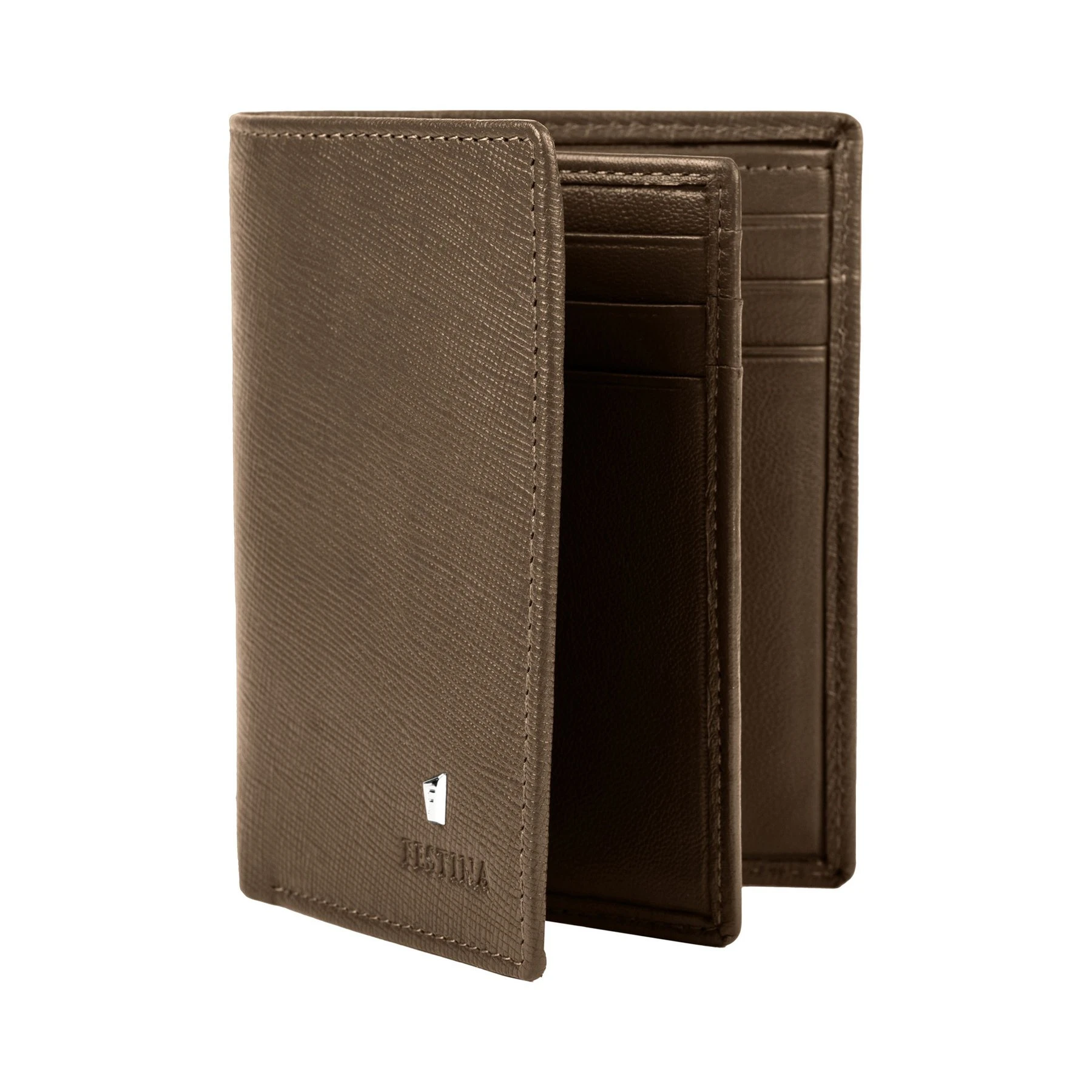 Този картодържател е в съвременната минималистична тенденция, компактен и практичен, с множество слотове за карти и две отделения за банкноти в горната част.