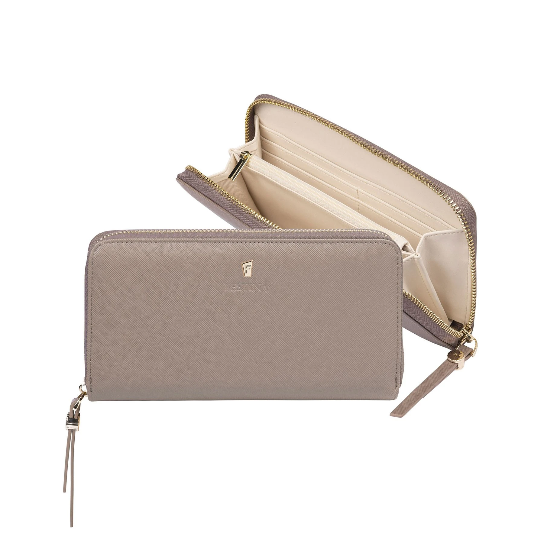 Ако желаете да брандираме този продукт за вас, моля, пишете на имейл customer_care@office1.bg или се обадете на 02 976 00 06. Дизайнът е илюстративен. Вижте отблизо красотата на дамския портфейл "Mademoiselle", изработен от прекрасно текстурирана сафианова веган кожа. Всеки детайл е деликатно изработен, като механизмите на циповете, украсени с Festina Blazon, са вдъхновени от емблематичните за марката бутони за спиране на часовника. Този бежов модел има контрастен почти бял цвят на вътрешната част и се отличава с изключителна визия. Портфейлът е брандиран с фино релефен надпис на Festina, под златистата версия на луксозното "F".