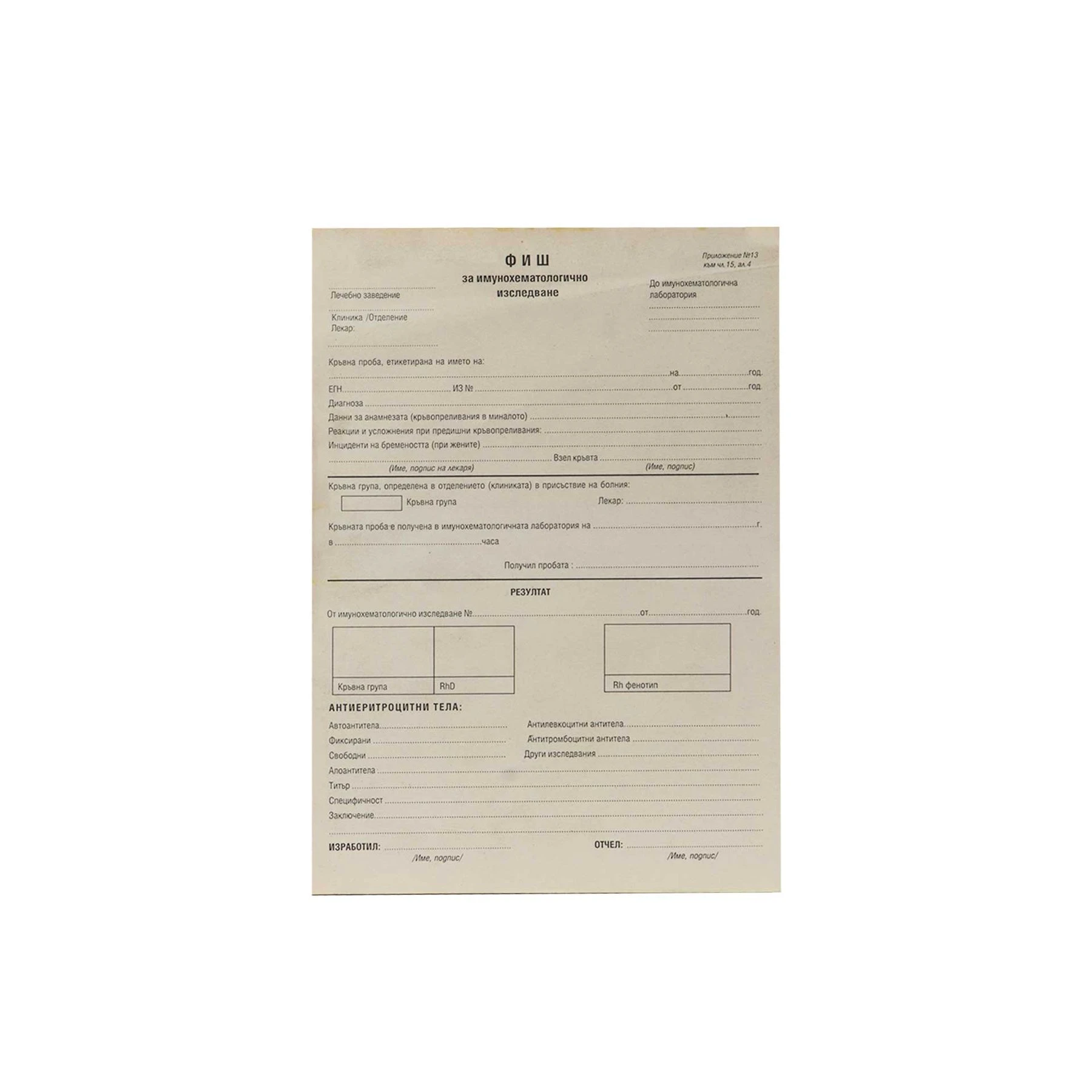 Фиш за имунохематологично изследване, приложение 13.