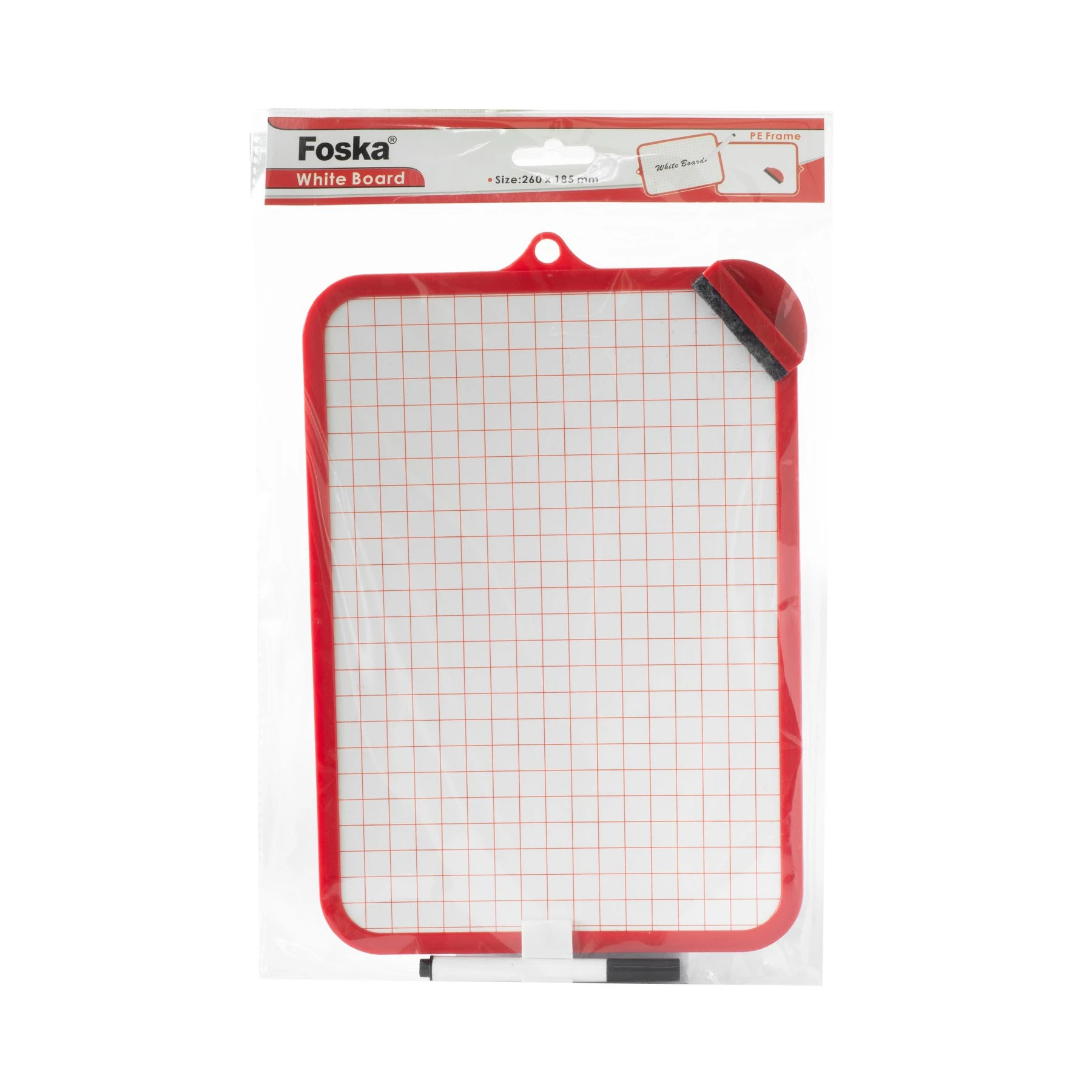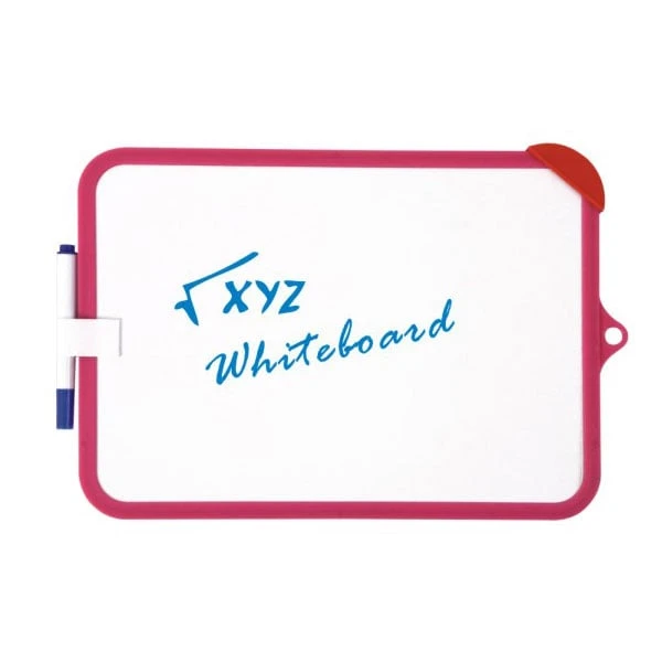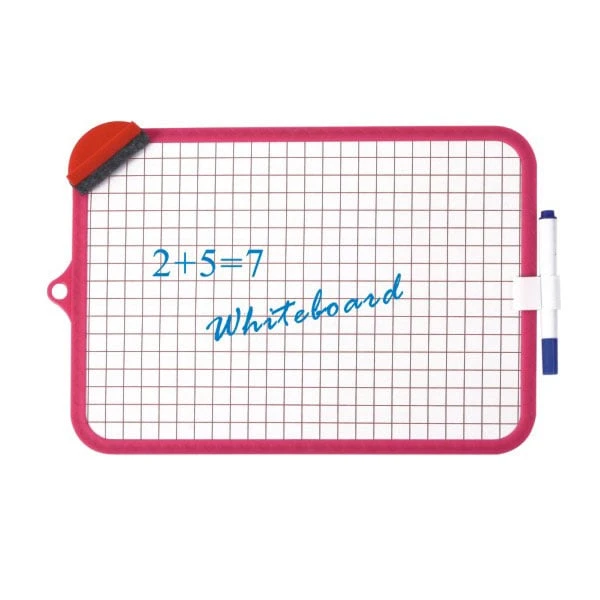 Бяла двустранна дъска, за писане с борд маркери. Бяла от едната страна и бяла на квадратчета от другата. Лека пластмасова рамка. Комплект с маркер за дъска и гъба. Размери: 18.5х26 cm.